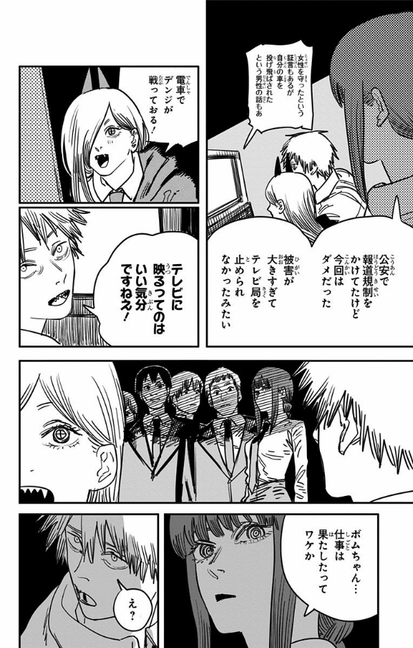 その姿が「恐怖!! デンノコ悪魔!!」としてTVで報道され、全世界に存在が知られることとなったデンジ!! イカれた凄腕の刺客達が、各国から東京に集結する中特異課は戦力を総動員し、デンジ防衛作戦を敷くが!? ルール無用で襲い殺し合う、地獄のカオスが渦を巻く!!