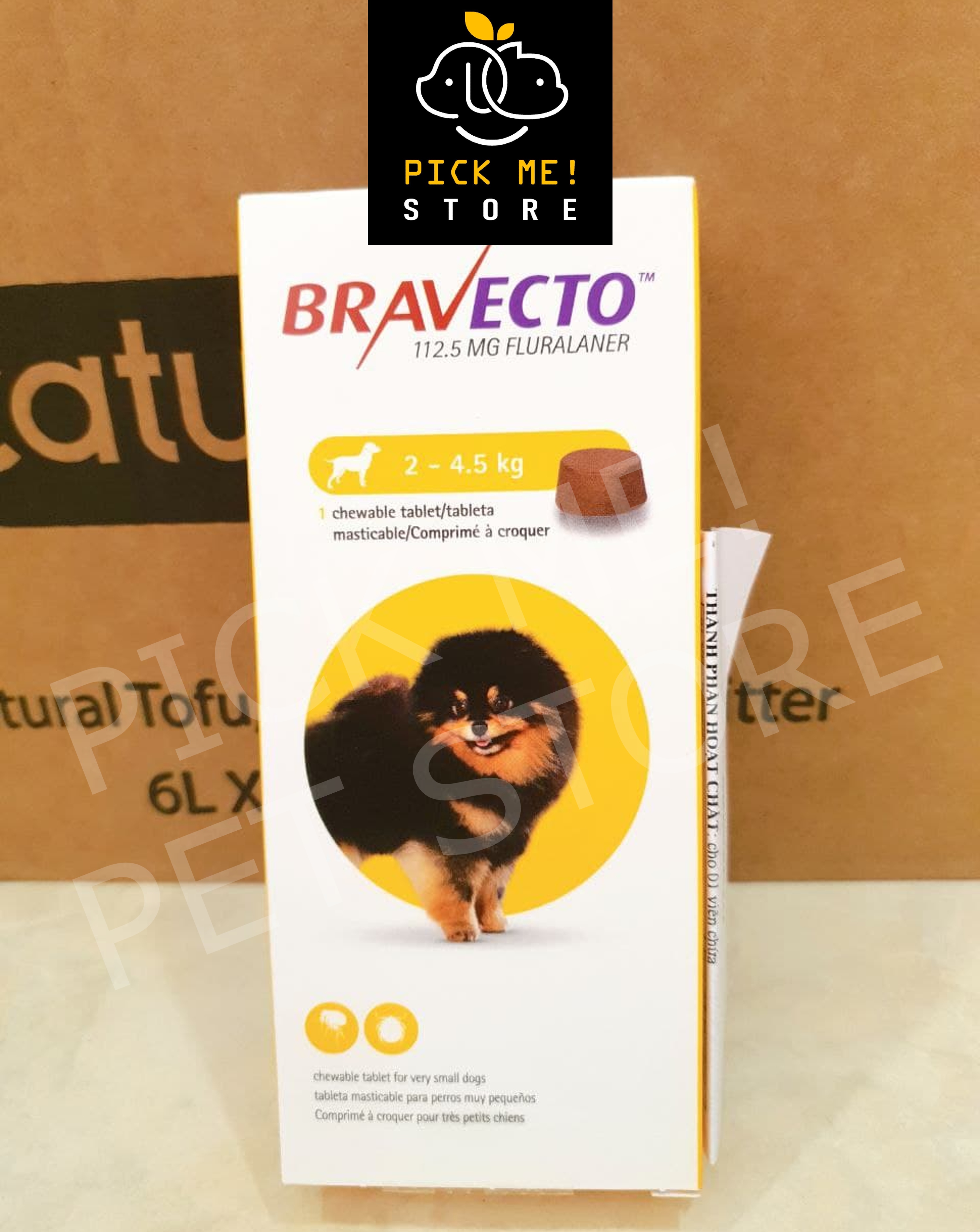 [1 Viên] Viên nhai BRAVECTO | Diệt Ghẻ Demodex, Ve Rận, Bọ Chét cho ChóXuất xứ: ÁoĐóng gói: 1 hộp x 1 viên Thành phần:Hoạt chất Fluralaner với hàm lượng:Chó rất nhỏ (2 - 4.5kg) ... 112.5mgChó ...