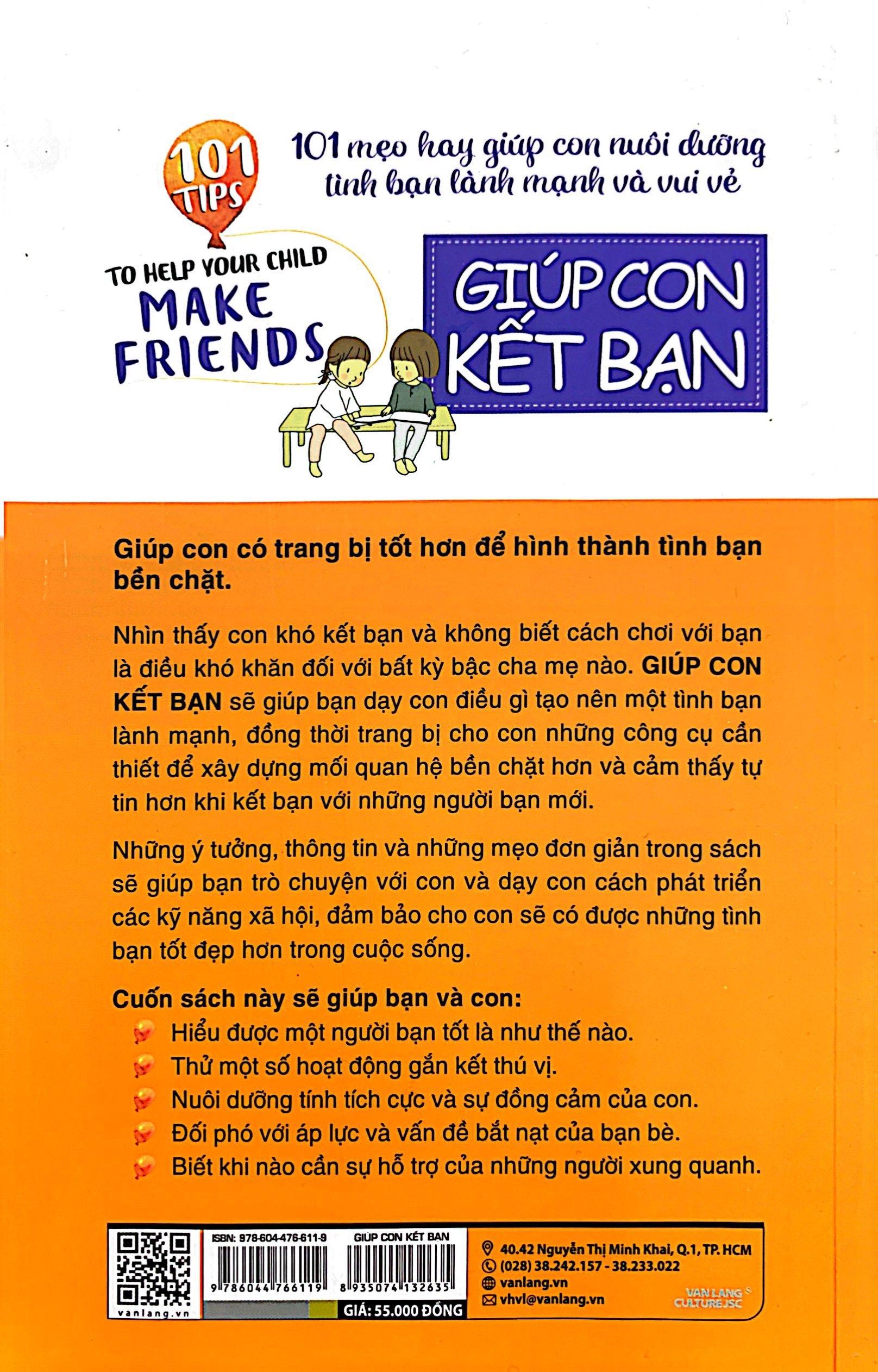 Mua tại Tiktok101 Tips - Giúp Con Kết Bạn Giúp con có trang bị tốt hơn để hình thành tình bạn bền chặt. Nhìn thấy con khó kết bạn và không biết cách chơi với bạn là điều khó khăn đối với bất kỳ bậc cha mẹ nào. 101 Tips - Giúp Con Kết Bạn sẽ giúp bạn dạy con điều gì tạo nên một tình bạn lành mạnh, đồng thời trang bị cho con những công cụ cần thiết để xây dựng mối quan hệ bền chặt hơn và cảm thấy tự tin hơn khi kết bạn với những người bạn mới. Những ý tưởng, thông tin và những mẹo đơn giản trong sách sẽ giúp bạn trò chuyện với con và dạy con cách phát triển các kỹ năng xã hội, đảm bảo cho con sẽ có được những tình bạn tốt đẹp hơn trong cuộc sống. Cuốn sách này sẽ giúp bạn và con:
