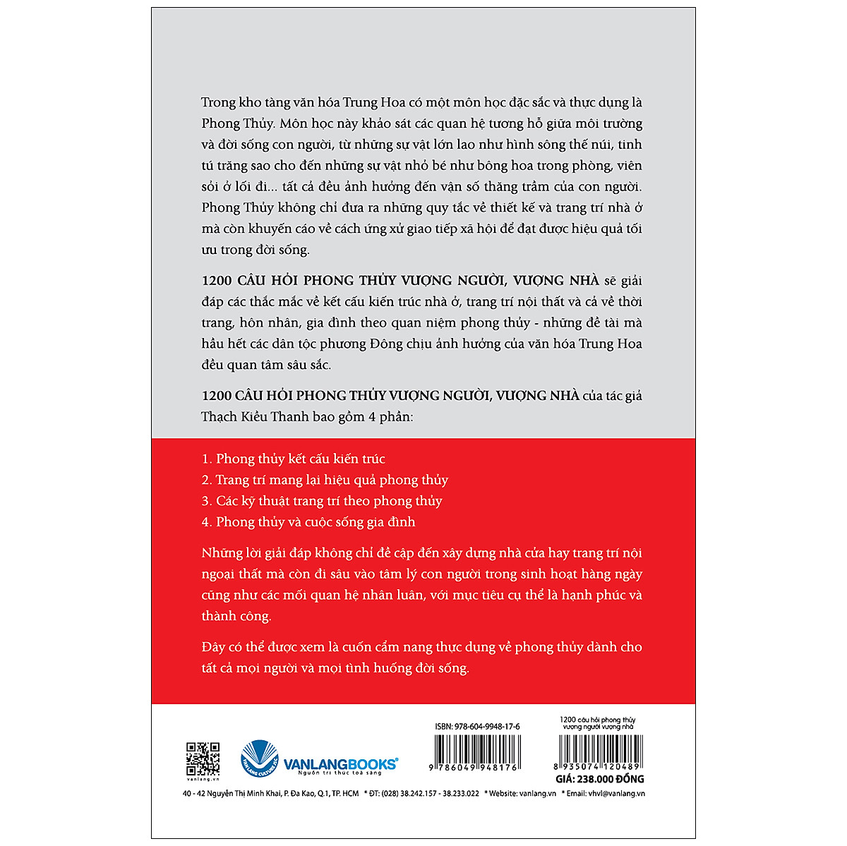 1200 câu hỏi phong thủy vượng người, vượng nhà của tác giả Thạch Kiều Thanh bao gồm 4 phần: