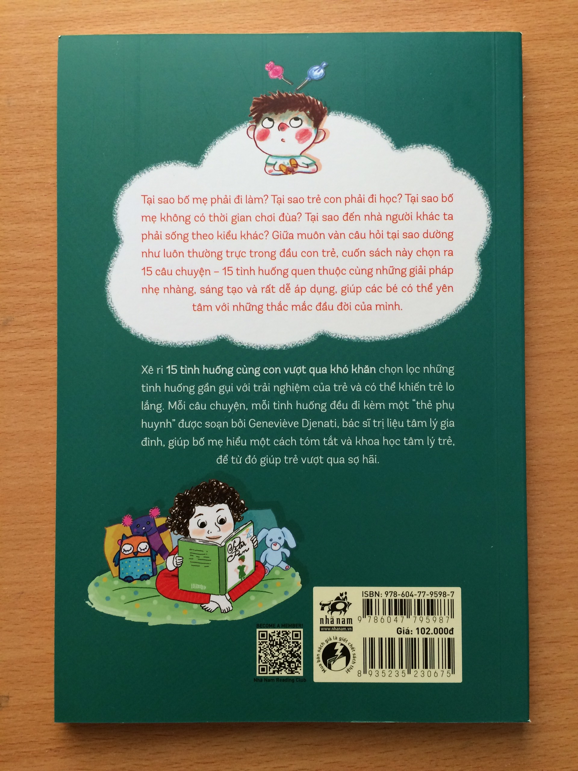 Xê ri 15 tình huống cùng con vượt qua khó khăn chọn lọc những tình huống gần gụi với trải nghiệm của trẻ và có thể khiến trẻ lo lắng. Mỗi câu chuyện, mỗi tình huống đều đi kèm một “thẻ phụ huynh” được soạn bởi Geneviève Djenati, bác sĩ trị liệu tâm lý gia đình, giúp bố mẹ hiểu một cách tóm tắt và khoa học tâm lý trẻ, để từ đó giúp trẻ vượt qua sợ hãi.