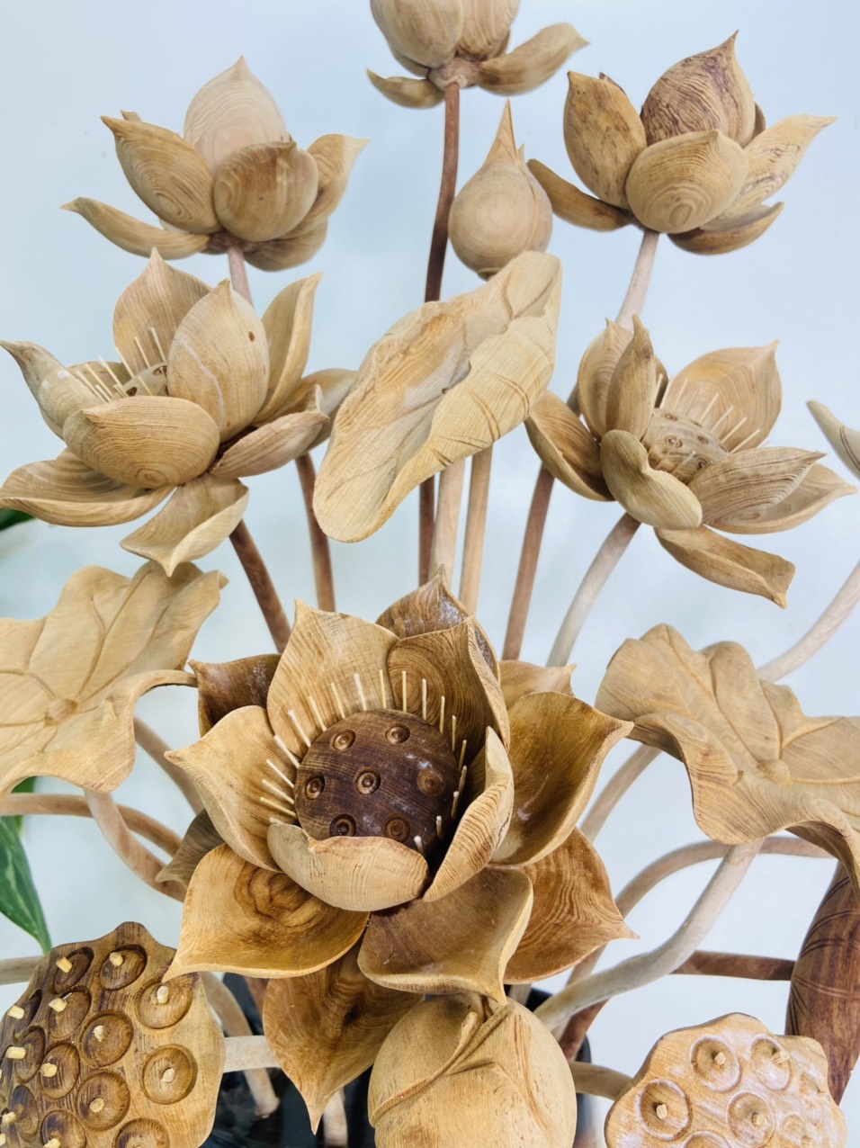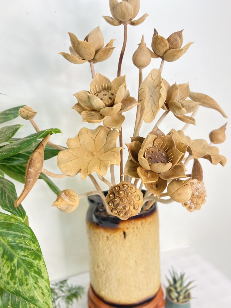 Cận cảnh chi tiết bình hoa sen ngọc am thơm, kết hợp gỗ nu cafe ,cực độc đáo để chơi tết 2022!
