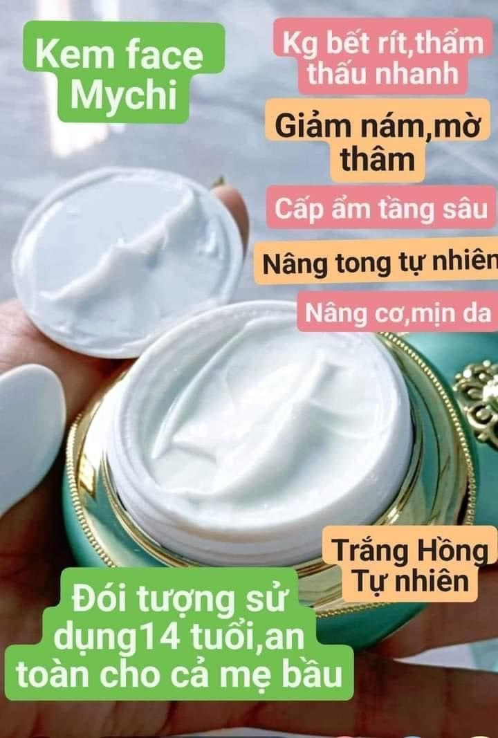- CÔNG DỤNG Chắc trong chị em đây không ai là không muốn bảo vệ da mặt của mình nhỉ. Bài hôm trước chúng ta đã biết về kem chống nắng của MyChi. Hôm nay Mỹ Phẩm MyChi cho ra mắt bộ sản phẩm Kem Face MyChi để giúp da mặt của mình được bảo vệ 1 cách tuyệt đối – Làm trắng da và đều màu da, cấp ẩm cho da. – Tăng độ đàn hồi cho da, tăng cường sản sinh collagen giúp da căng mướt hồng hào tự nhiên – Hỗ trợ ngừa nám, phá huỷ sắc tố melanin gây nám da. làm sáng và dịu da. Có khả năng thẩm thấu sâu ( thẩm thấu đa tầng) vào da giúp làm sáng da đối với các tổn thương do ánh nắng mặt trời có thể nhìn thấy, đốm đồi mồi hoặc sẹo và từ đó cải thiện khả năng chống lão hóa trên da. – Cải thiện sắc tố da tại các điểm bị tổn thương vì sẹo mụn, dưỡng sáng da từ từ nhẹ nhàng hơn, thích hợp với làn da nhạy cảm và kể cả da nhiễm corticoid