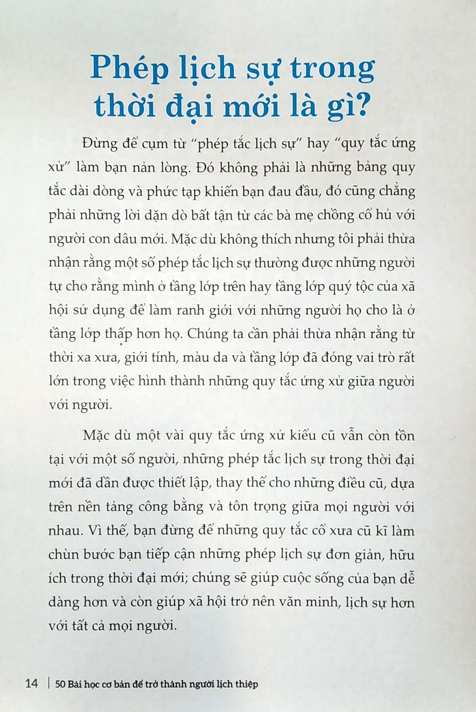 Gặp gỡ người lạ trong một bữa tiệc, đi chung thang máy với sếp lớn hay từ chối cuộc hẹn lần thứ hai vì cuộc hẹn đầu tiên thật thảm họa - các tình huống xã hội như vậy luôn đòi hỏi bạn phải làm và nói những điều phù hợp. 50 Bài Học Cơ Bản Để Trở Thành Người Lịch Thiệp sẽ chỉ cho bạn cách xử lý những thử thách thông thường này thật tự tin và dễ dàng. Hãy quên quy tắc phải dựng ngón tay út lên khi uống trà đi - cuốn sách này bao gồm rất nhiều ví dụ thời hiện đại về việc xử lý bất kì tình huống khó xử nào.