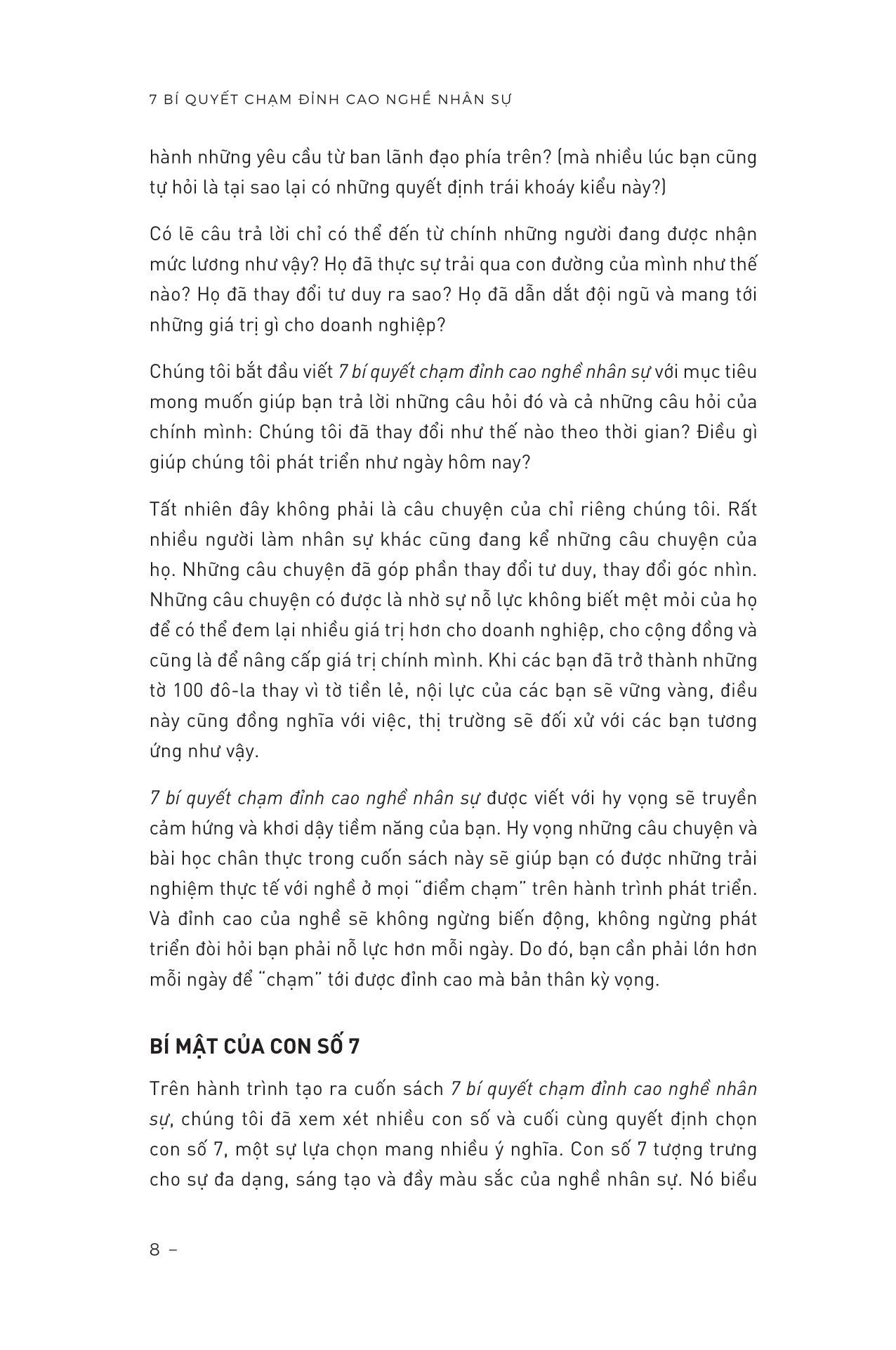 Chúng tôi viết cuốn sách 7 bí quyết chạm đỉnh cao nghề nhân sự với mục tiêu mong muốn giúp bạn trả lời những câu hỏi đó và trả lời cả những câu hỏi của chính m.ình: “Chúng tôi đã thay đổi như thế nào theo thời gian? Điều gì giúp chúng tôi phát triển như ngày hôm nay?".