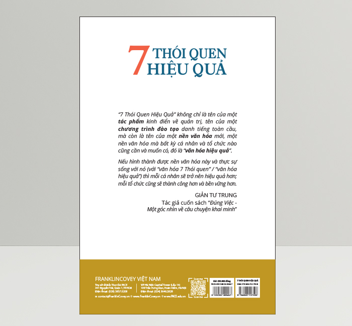 “7 Thói Quen Hiệu Quả” không chỉ là tên của một tác phẩm kinh điển về quản trị, tên của một chương trình đào tạo danh tiếng toàn cầu, mà còn là tên của một nền văn hóa mới. Một nền văn hóa mà bất cứ cá nhân, tổ chức hay xã hội nào cũng cần và muốn có, đó là “văn hóa hiệu quả”.