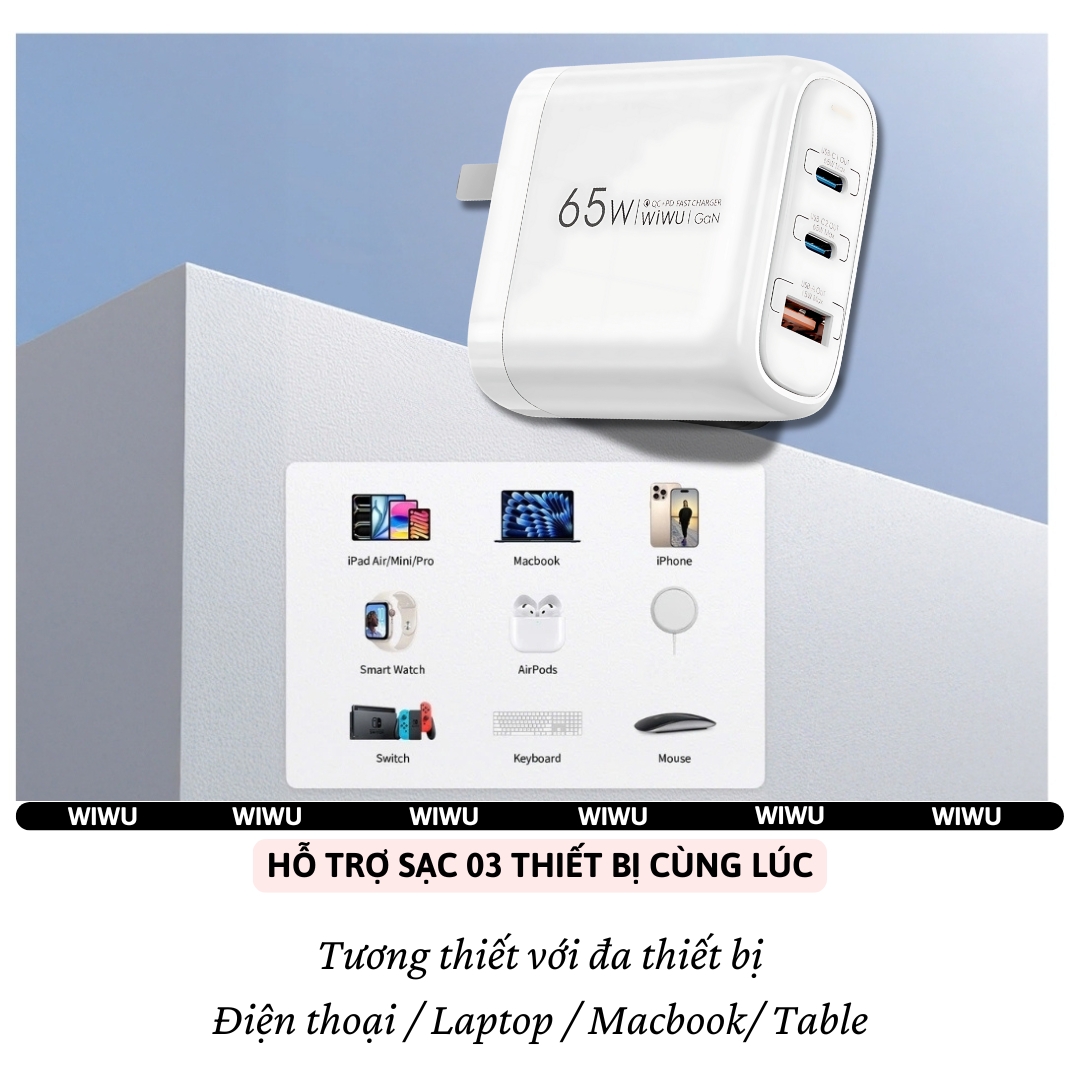 Bộ Sạc Nhanh Đa Cổng WIWU WI-U024 Ark GaN 65W QC & PD – Sạc PD 3.0, QC 3.0, Hỗ Trợ Laptop – Công Nghệ GaN Nhỏ Gọn, An Toàn