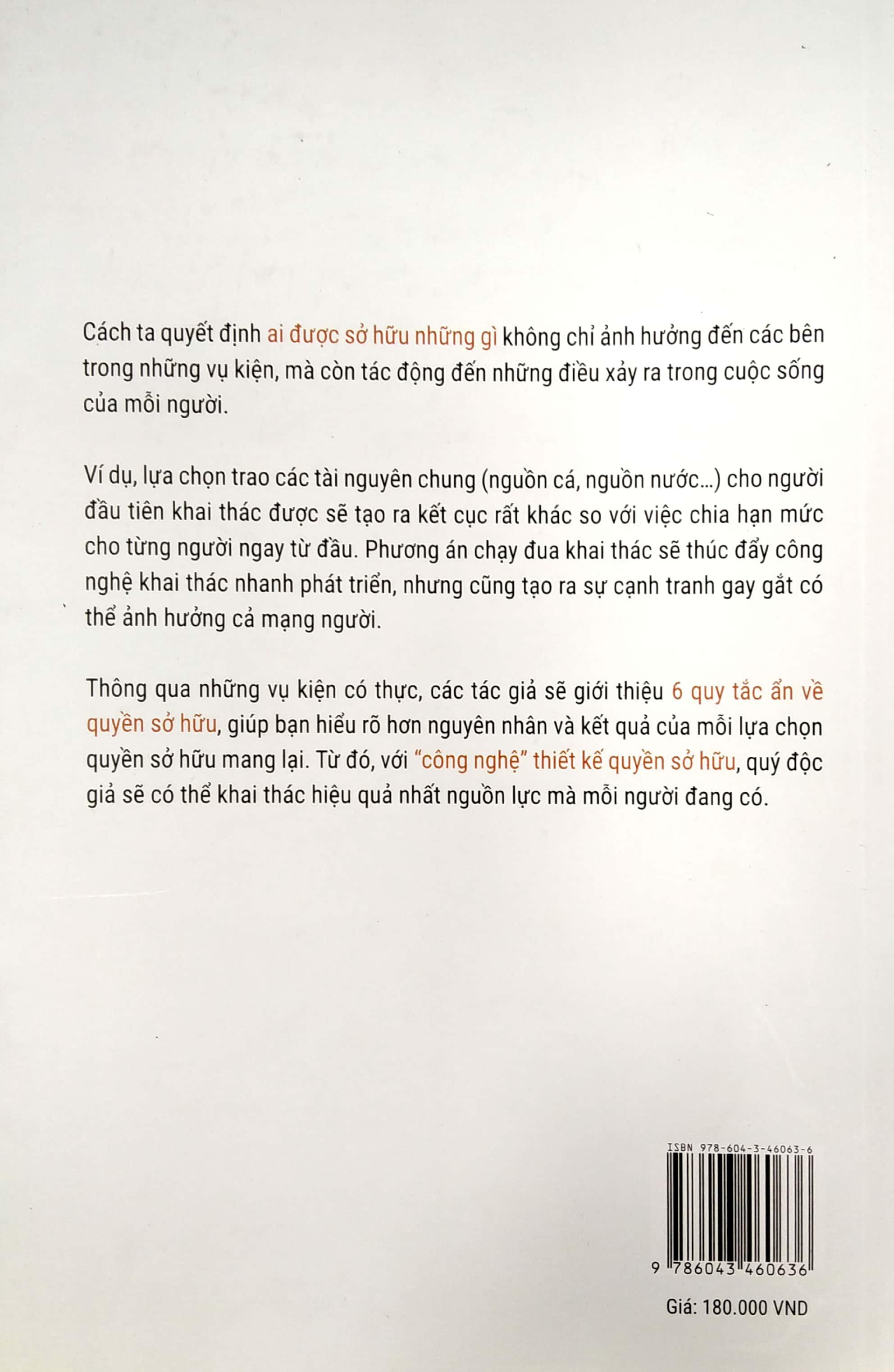 Thông qua những vụ kiện có thực, các tác giả sẽ giới thiệu 6 quy tắc ẩn về quyền sở hữu, giúp bạn hiểu rõ hơn nguyên nhân và kết quả của mỗi lựa chọn quyền sở hữu mang lại. Từ đó, với “công nghệ” thiết kế quyền sở hữu, quý độc giả sẽ có thể khai thác hiệu quả nhất nguồn lực mà mỗi người đang có.