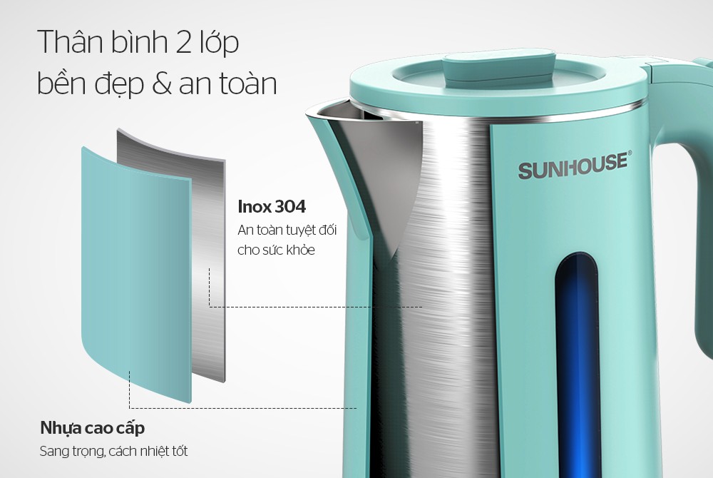 - Đặc biệt, ấm siêu tốc inox 304 2 lớp 1.8L SUNHOUSE SHD1351 còn được trang bị đèn báo hoạt động vừa tiện lợi, vừa tăng tính thẩm mỹ.