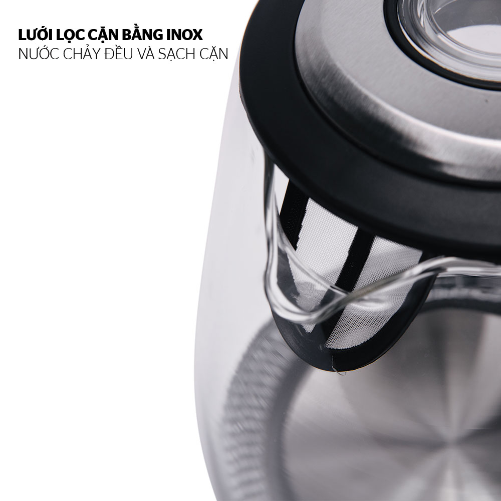 Thân bình ấm bằng thủy tinh trong suốt, kiểu dáng tao nhã nên khi đặt cùng bàn trà tiếp khách trông rất sang trọng và lịch sự.