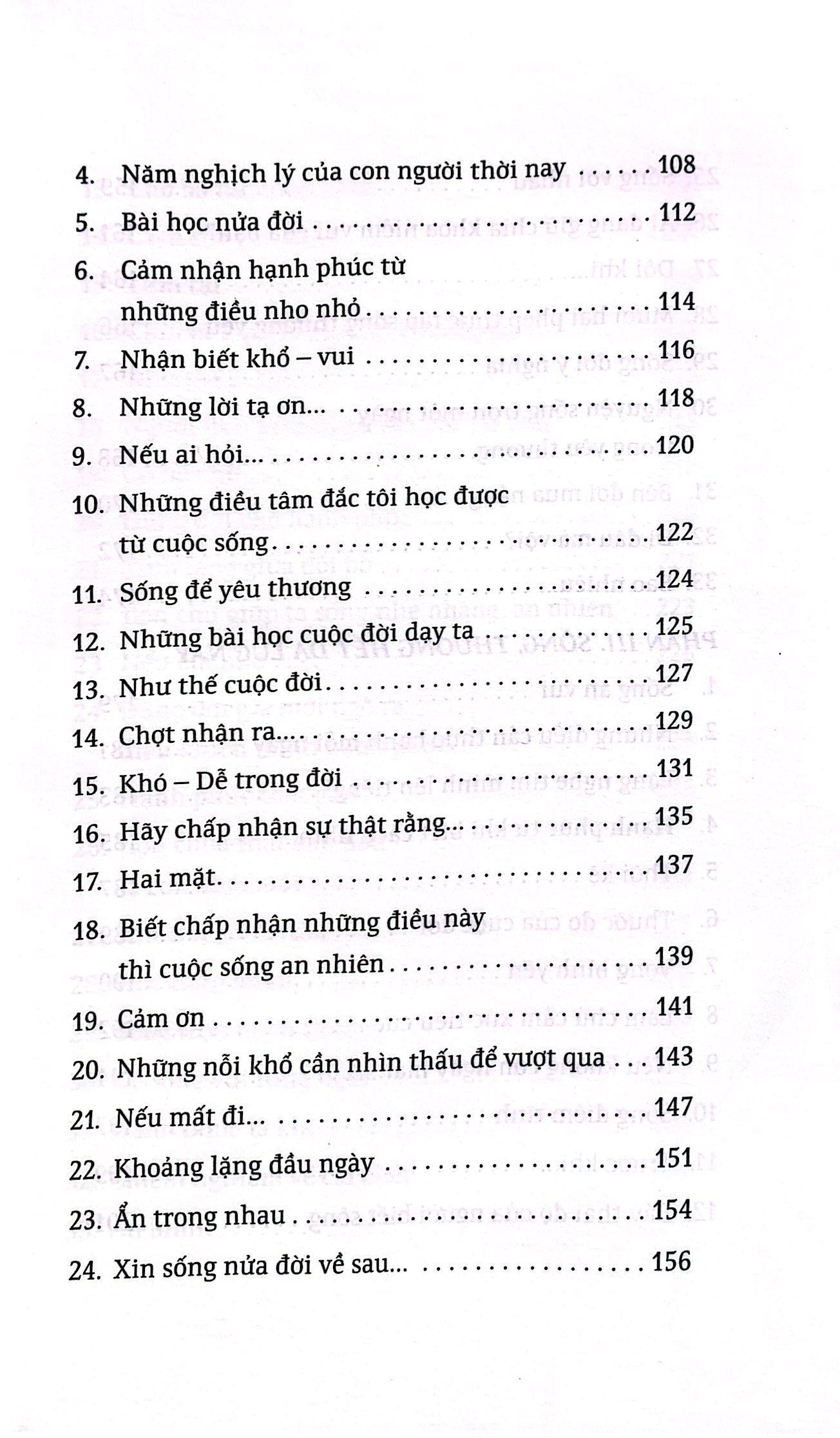 Những bài văn mang đậm chất triết lý, chất chứa các bài học trị liệu nỗi khổ niềm đau của kiếp sống con người: “Khi đến với cuộc đời này, ta chẳng mang theo thứ gì, khi rời đi, ta chỉ như một làn khói. Ngẫm lại đời người thật đơn giản vậy! Vinh hoa phú quý rồi cũng thoáng qua theo ngày tháng, ân ái tình thù rồi cũng trở về với cát bụi”.