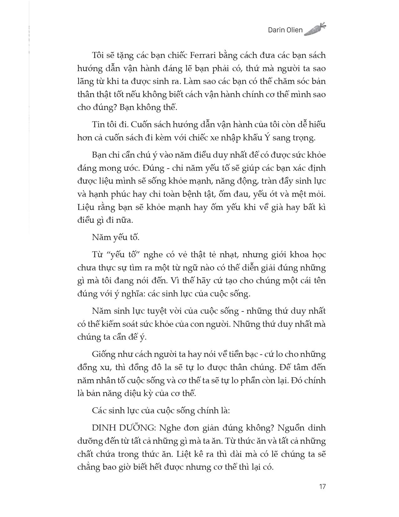 Trong Ăn sạch sống xanh, tâm lành trí khỏe, Darin Olien cung cấp cho chúng ta một cách suy nghĩ hoàn toàn mới về sức khỏe và hạnh phúc bằng cách xác định các động lực sống: Dinh dưỡng chất lượng, Hydrat hóa, Giải độc, Oxy hóa và Kiềm hóa, cho chúng ta biết cách duy trì cân nặng hợp lý, ngăn ngừa ngay cả những căn bệnh nghiêm trọng nhất. Chúng ta luôn được dạy phải xem máu, xương, da, các cơ quan, các nơ-ron thần kinh và tất cả mọi thứ khác một cách riêng rẽ và mỗi bộ phận lại mang đến những vấn đề hay mối lo ngại không giống nhau. Nhưng sự thật là, mỗi một bộ phận nhỏ nhất bên trong cơ thể người, mọi phân tử và tế bào đều phản ứng với năm sinh lực của cuộc sống kể trên. Việc ta cần làm chỉ là làm sao nắm bắt những yêu cầu đó - năm sinh lực của cuộc sống. Và sau đó, ta phải cố gắng hết sức để hoàn thành.