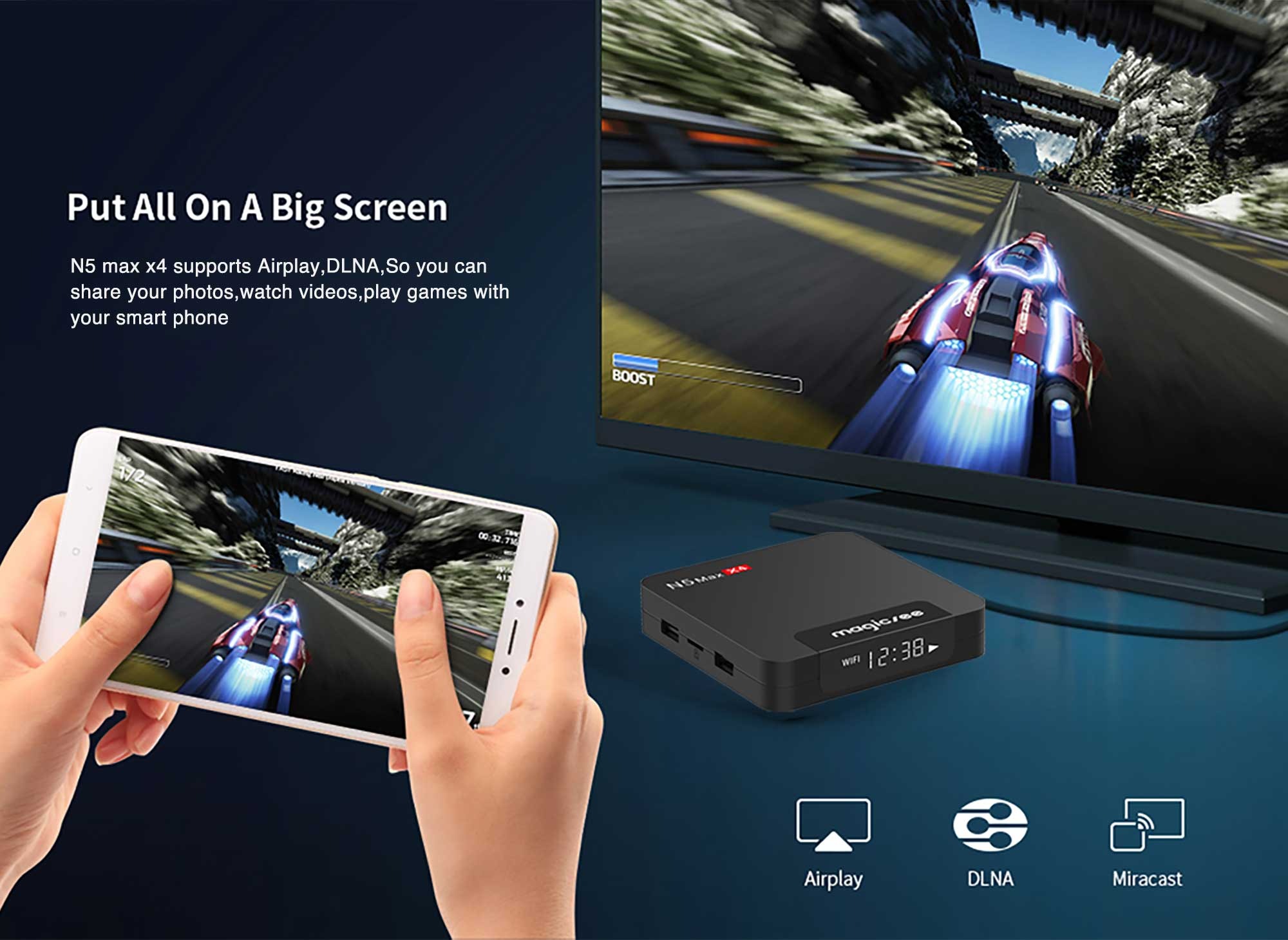 - Có thể cắm Amply , Hát Karaoke, Thay thế đầu PS kết nối loa không dây Thiết bị n5 max x4 xem phim Full HD cõ hỗ trợ xem phim 4K cho các dòng TV cao cấp n5 max x4 được thiết kế không khác gì một chiếc điện thoại cao cấp ngoại trừ tính năng nge và gọi. Các bạn có thể vào mạng, lướt web, xem phim, xem bóng đá, đọc tin tức. Thiết bị android TV n5 max x4 sẽ thay thế và bổ trợ cho các dòng TV đã là Smart Tv hoặc chỉ là TV thông thường. Đặc biết các bạn có thể thoải mái truy cập vào kho ứng dụng CH PAY của Google tải bất kỳ ứng dụng nào muốn vè TV nhà bạn. Google tải bất kỳ ứng dụng nào muốn vè TV nhà bạn. Amlogic S905X4 Amlogic S905X4 áp dụng bộ xử lý lõi tứ Cortex-A55, nó là "bộ xử lý ứng dụng tiên tiến được thiết kế cho các n5 max x4 OTT / IP Set-Top Box (STB) cao cấp. Các lõi Cortex-A55 cung cấp tới hai lần hiệu suất so với Cortex-A53 về điểm chuẩn bộ nhớ và cải thiện hiệu suất 20 đến 30% điển hình hơn cho các tác vụ thông thường ở cùng tần số. Hệ điều hành Android 11 Nó dựa trên hệ điều hành Android 11 mới nhất, với tốc độ cao và hiệu năng mượt mà, được thiết kế để biến TV thông thường của bạn thành một tivi thông minh. Độ phân giải 8K UHD Độ phân giải hình ảnh thật 8k có thể lên tới 7680 4320 để đạt được độ chính xác gấp 16 lần hình ảnh 1080p. USB 3.0 Tốc độ đọc / ghi cao. USB 3.0 có tốc độ tối đa 5 gigabit mỗi giây, về mặt lý thuyết nhanh hơn mười lần so với USB 2.0. WiFi băng tần kép 2.4G / 5G Với sự hỗ trợ cho băng tần 2.4Ghz và 5Ghz, nó có thể truyền lượng dữ liệu cao hơn. Thiết bị xem phim Full HD cõ hỗ trợ xem phim 4K cho các dòng TV cao cấp n5 max x4 được thiết kế không khác gì một chiếc điện thoại cao cấp ngoại trừ tính năng nge và gọi. Các bạn có thể vào mạng, lướt web, xem phim, xem bóng đá, đọc tin tức. Thiết bị n5 max x4 sẽ thay thế và bổ trợ cho các dòng TV đã là Smart Tv hoặc chỉ là TV thông thường. Đặc biết các bạn có thể thoải mái truy cập vào kho ứng dụng CH PAY của Google tải bất kỳ ứng dụng nào muốn vè TV nhà bạn. Google tải bất kỳ ứng dụng nào muốn vè TV nhà bạn. TẤT CẢ ĐÃ CÓ TRONG THIẾT BỊ ANDROID TV Về mặt trước nổi bật trên mặt sản phẩm là Logo Magicsee N5 max X4 được in nổi chính là điểm ấn tượng đầu tiên Sản phẩm có thiết kế nhỏ gọn với chiều ngang 10.5, chiều dài 10.5, chiều cao 2.8cm . android tivi box cũng chạy trên Android 11 Như đã thấy, ở mặt sau vẫn là cách bố trí các cổng kết nối quen thuộc, bao gồm 2 cổng USB ,1 khe thẻ, 1x AV, 1 cổng HDMI, cổng mạng JR45 và một cổng nguồn DC 5V-2A, cổng âm thanh số n5 max x4 hiện đang là sản phẩm được ưu chuộng trên thị trường không những bởi hiệu suất tuyệt vời của nó mà con do thiết kế . Với thiết kế mang phong cách cách của 1 siêu phẩm sản phẩm chỉ nhỏ gọn bằng 1 chiếc smart phone mang đến sự hiện đại và sang trang cho ngôi nhà bạn. CPU : Amlogic S905X4 64-bit Quad Core ARM Cortex A55 CPU GPU : G31 MP2 Bộ xử lý GPU Bộ nhớ LPDDR4: 4GB Rom: 32GB Wifi :IEEE 802.11 A/B/g/n/AC; 2.4G / 5G Hệ điều hành : Android 11 Bluetooth 1 HDMI,HD 2.1, Hỗ Trợ HD CEC, HDR và và 8K x 4K @ 24 Độ phân giải đầu ra 1 AV OUT 480i/576i tiêu chuẩn đầu ra độ nét 3 USB 1 USB 3.0 ; 2 USB 2.0 1 * Giao Diện Ethernet; Hỗ Trợ 10/100M