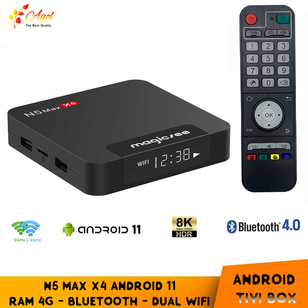 AGOL SHOP XIN GIỚI THIỆU SẢN PHẨM Android tivi box MAGICSEE N5 MAX X4 Ram 4G Android 11, S905X4, wifi 2 băng tần, bluetooth cài sẵn phim, truyền hình cáp miễn phí vĩnh viễn cáp miễn