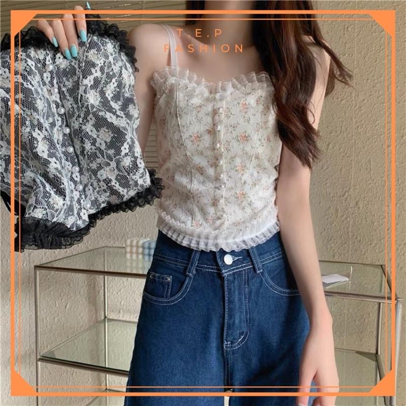 Áo bra 2 dây ren hoa nhí viền bèo có mút đính cúc ngọc tiểu thư