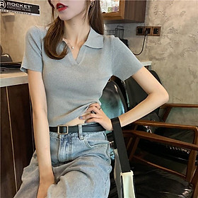 Áo croptop dệt kim tay ngắn cổ polo thời trang Hàn Quốc thanh lịch