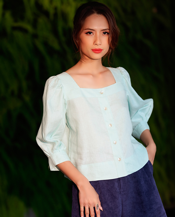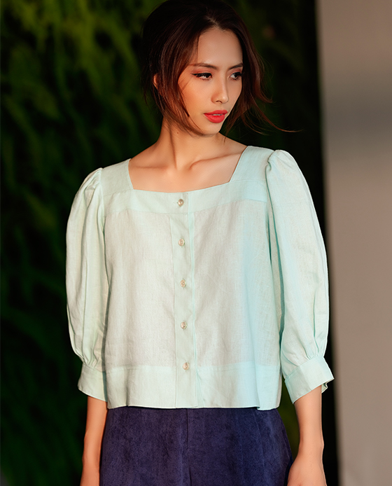 Áo Croptop Linen Aqua TOP132 Thời trang thiết kế HityKiểu dáng áo suông rộng ngắn ngang lưng quần croptopCổ vuôngTay phồng nhún vaiCài bằng hàng nút phía trướcCHẤT LIỆULinenNút vò sò xanh tự n...