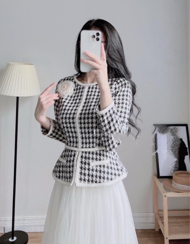 ✨Áo dạ tweed trắng đen peplum công sở hàn quốc sang chảnh tay dài zíc zắc cao cấp