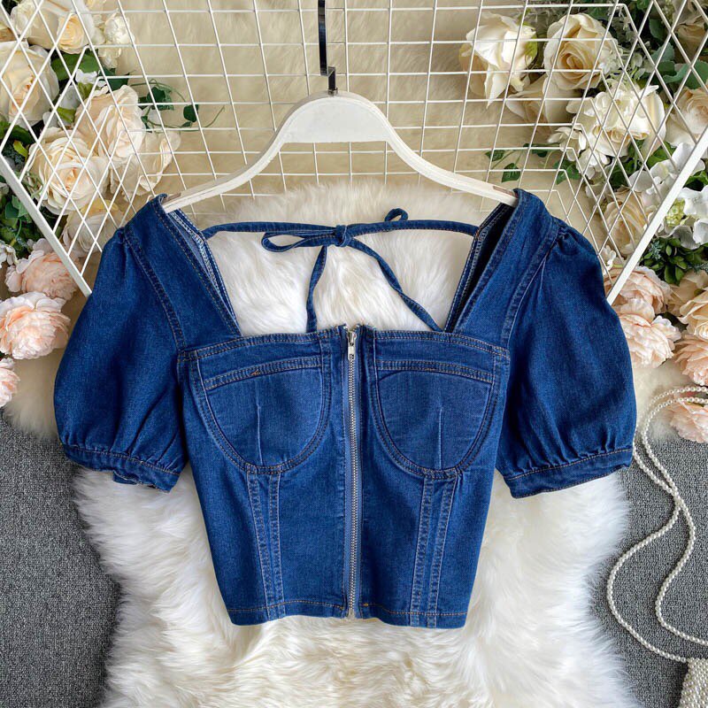 ✨Áo denim croptop cổ vuông phong cách gợi cảm cho nữ