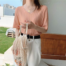 Mua tại Tiktok- Áo len nữ ngắn tay cổ tim, áo len tăm thu đông trơn suông Ale62 được thiết kế thanh nhã với kiểu dáng trẻ trung
