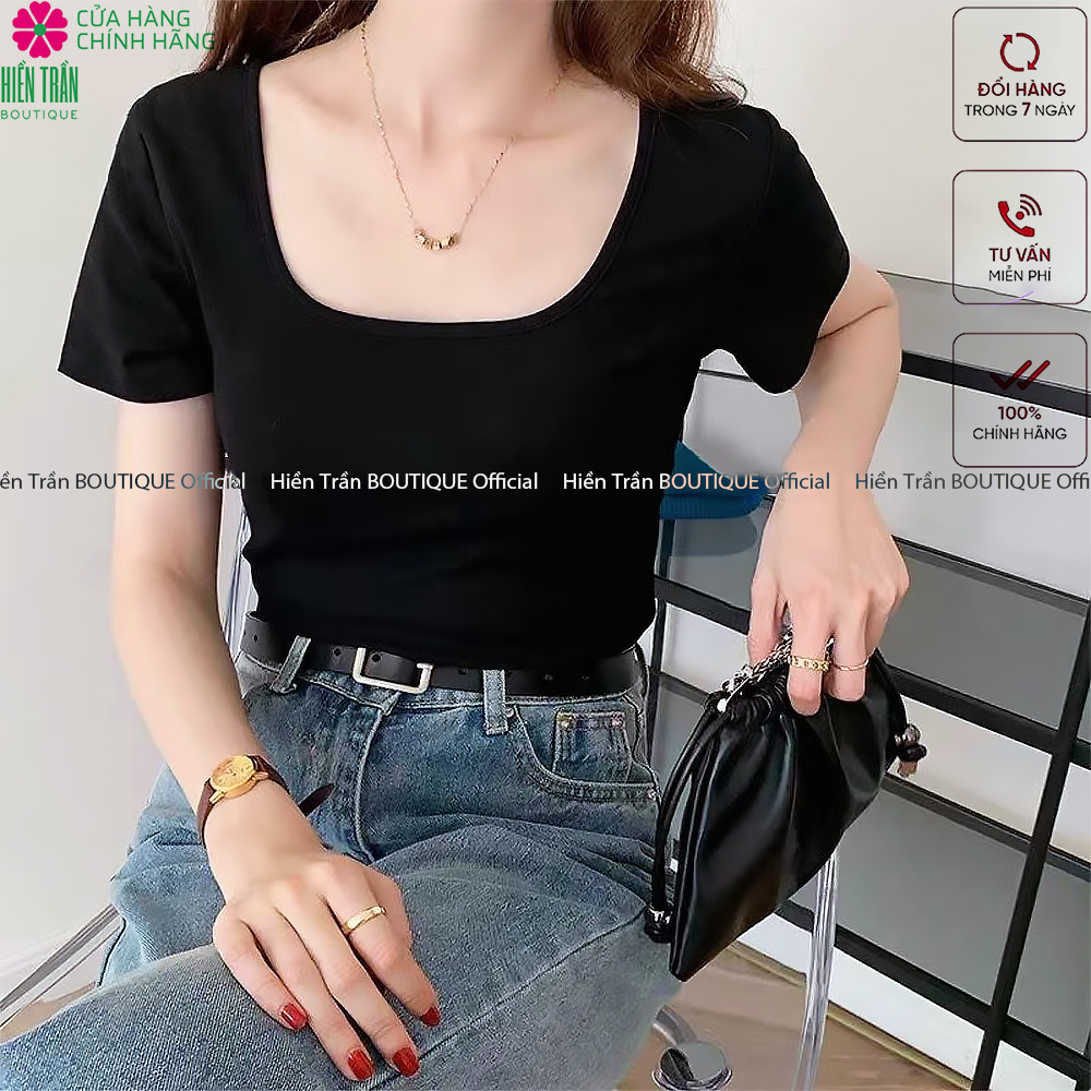 ✨Áo phông nữ Hiền Trần BOUTIQUE cổ vuông cộc tay form đẹp thun trơn co giãn tốt màu đen trắng thời trang basic