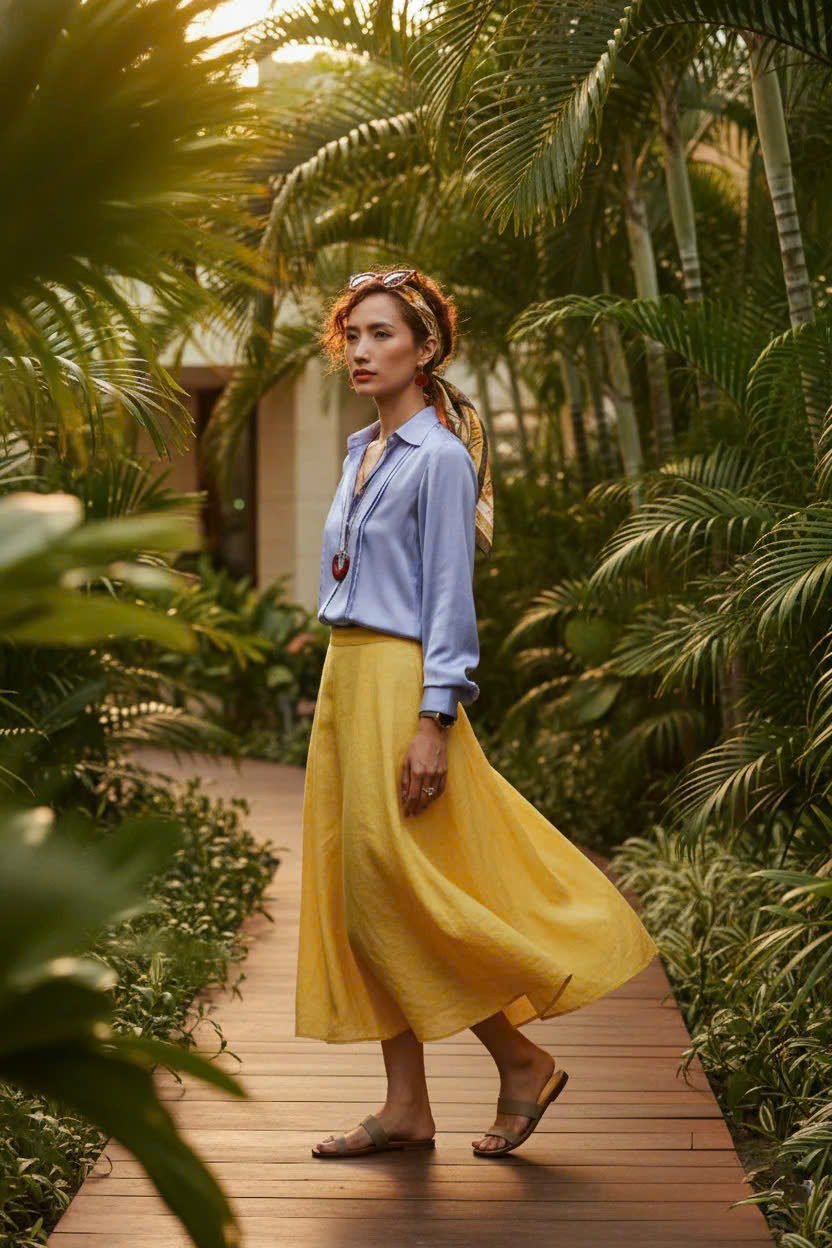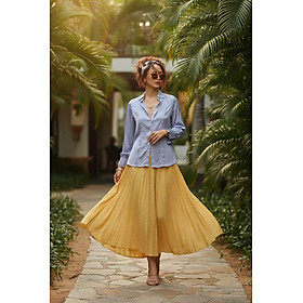 - Công sở hiện đại: Kết hợp hoàn hảo với chân váy linen màu vàng Golden Sand để tạo nên bộ đôi tương phản nổi bật. Sơ vin áo gọn gàng để khoe vòng eo và tạo phom dáng thon thả.