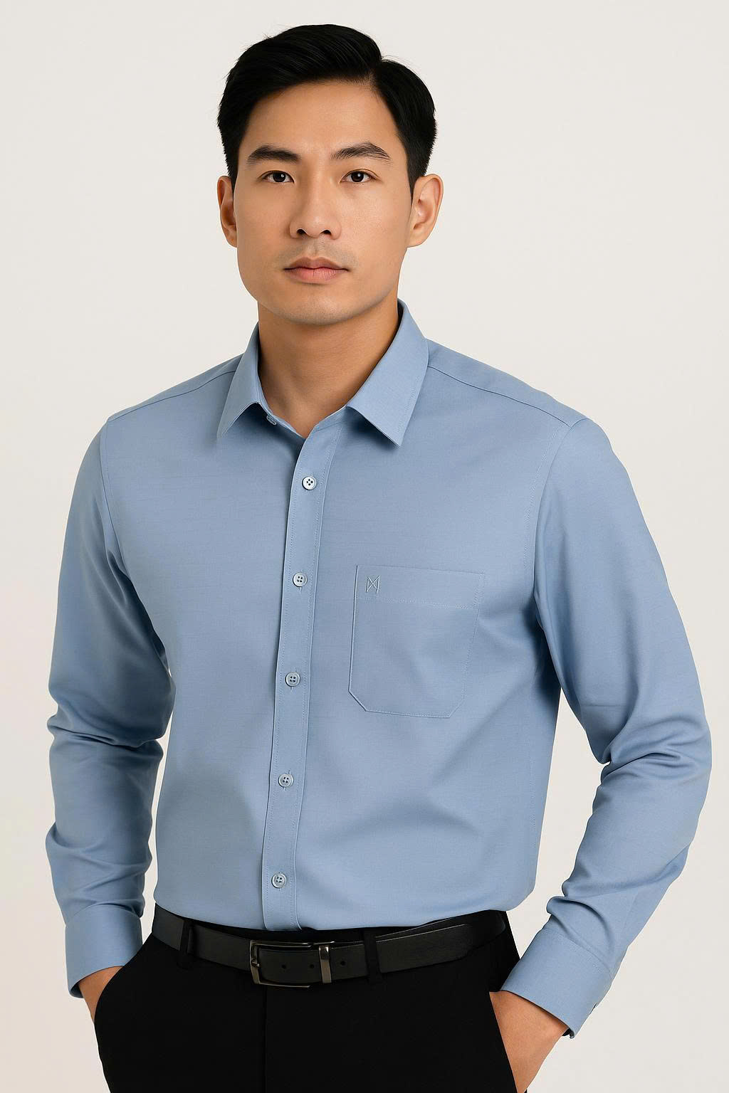 Thiết kế: Màu xanh trang nhã, họa tiết dệt chìm tinh tế, cổ bẻ cổ điển, tay dài lịch sự, phù hợp với nhiều phong cách phối đồ.