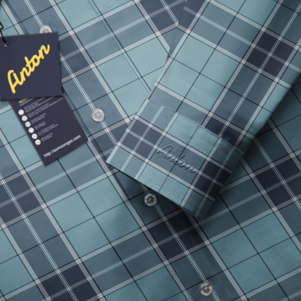 Áo Sơ Mi Nam Công Sở Trung Niên Thương Hiệu Anton Dài Tay Vải Sợi Tre Xanh Dương Kẻ Caro Chìm AT203