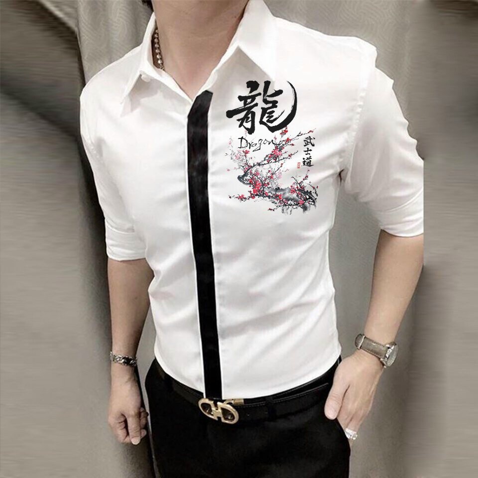 Thiết kế Áo sơ mi nam viền đen họa tiết cây hoa anh đào và chữ tàu cao cấp phong cách đường may tỉ mỉ.