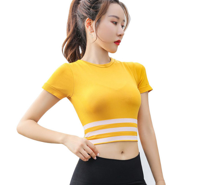 Áo croptop tập gym nữ thể thao yoga aerobic vàng phối kẻ trắng | CX4508