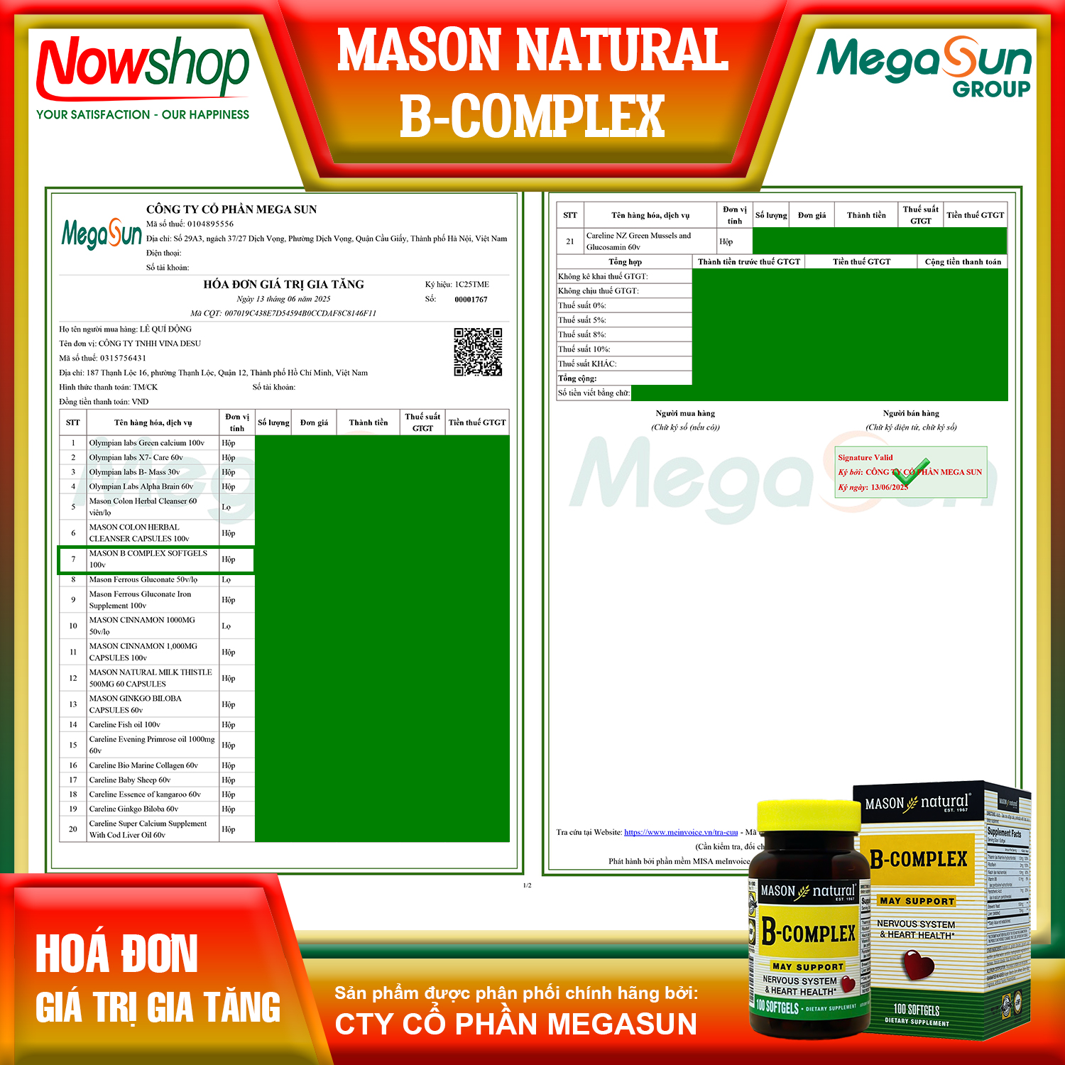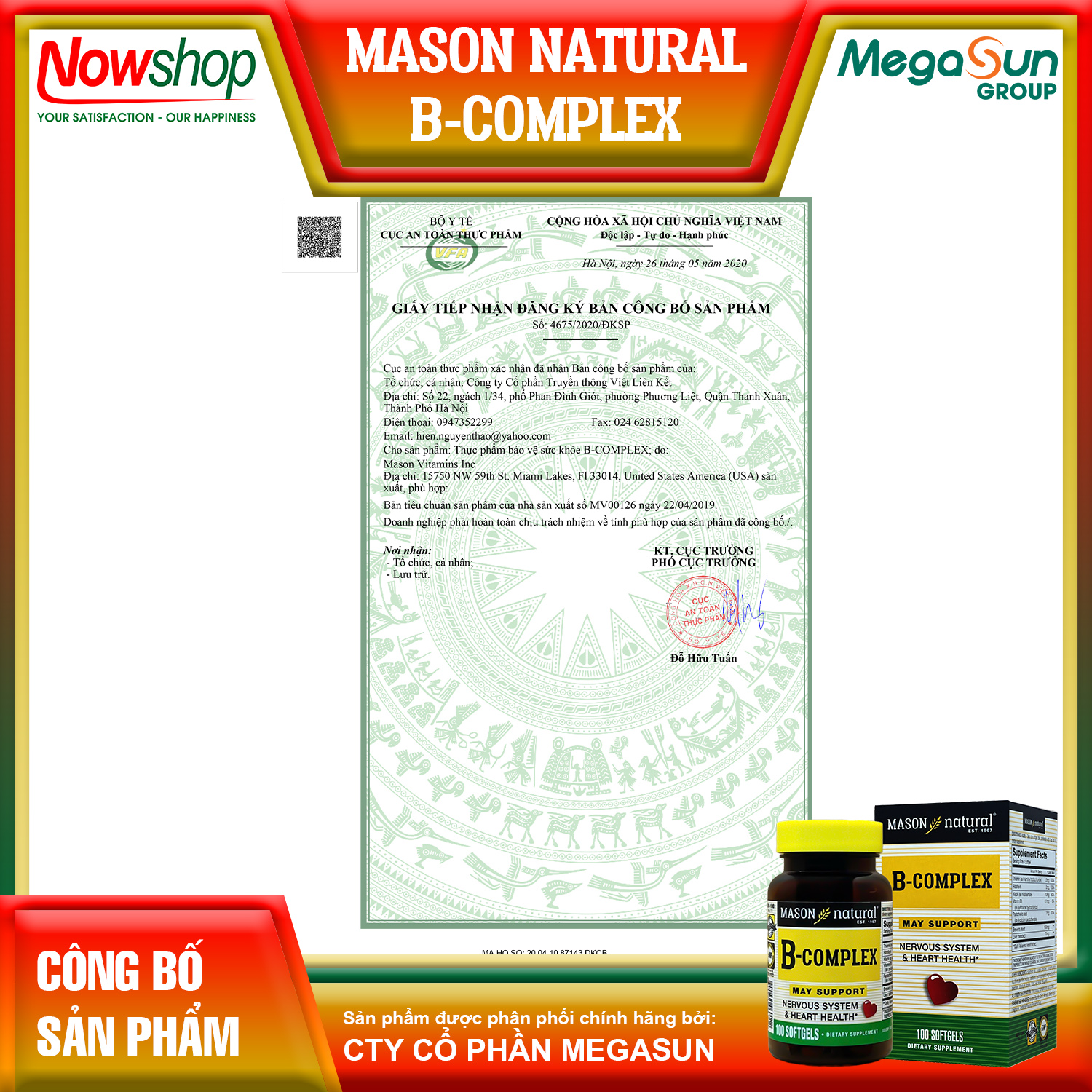 Mason B-Complex - Bổ sung Vitamin B toàn diện - Duy trì trí nhớ, giảm mệt mỏi, tăng tập trung Công thức chuẩn Mỹ - Hấp thu nhanh, hiệu quả lâu dài, an toàn cho