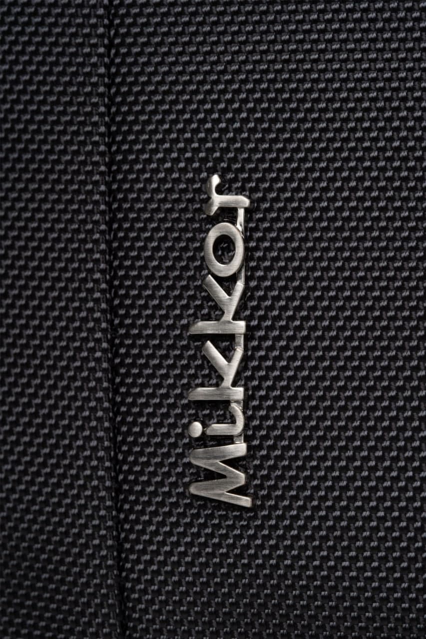 Mặt trước balo đính logo chú sói biểu tượng thương hiệu và logo hợp kim MIKKOR nổi bật.