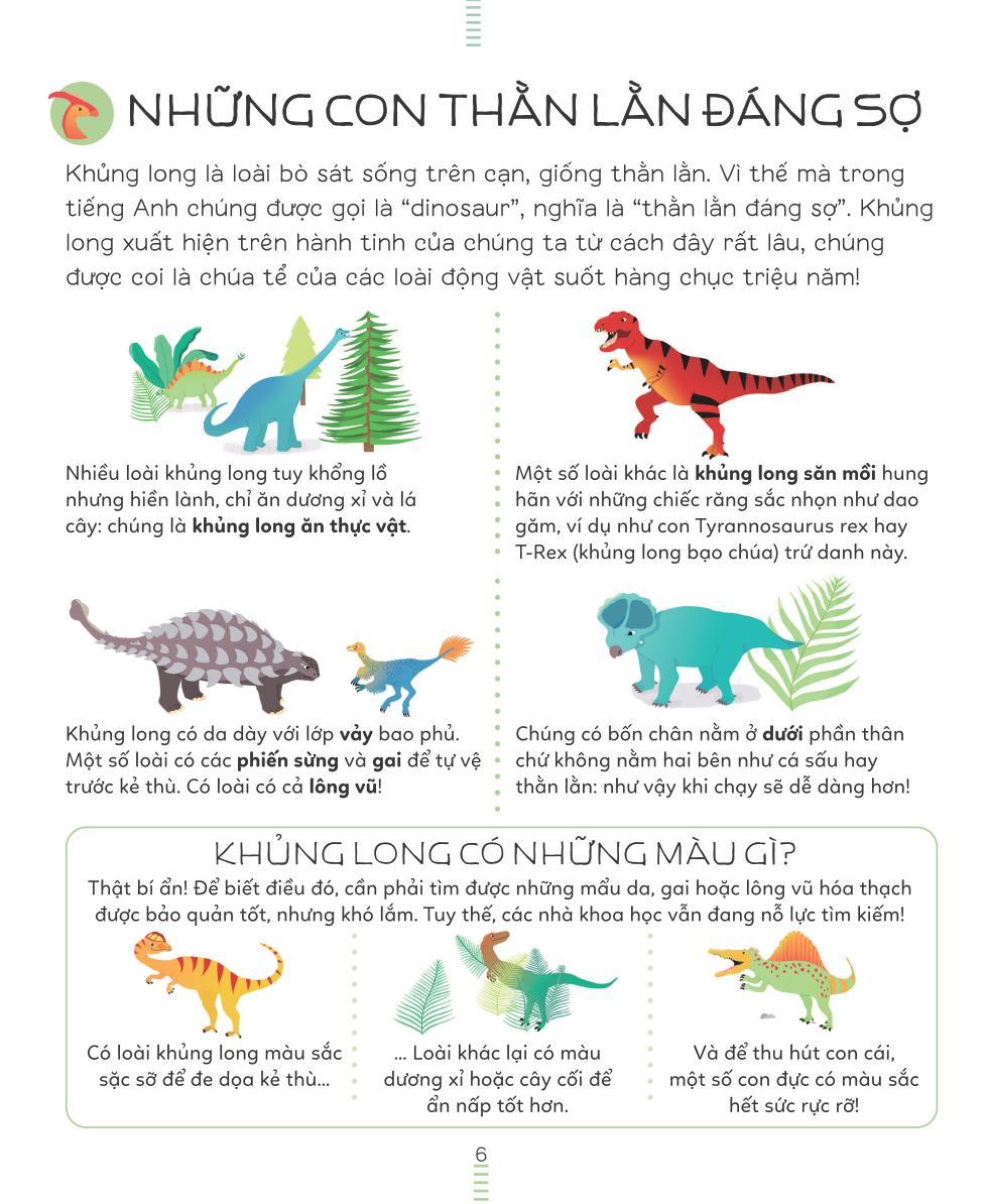 Mua tại TiktokKhủng long không chỉ gồm các loài to lớn xù xì đâu, mà đa dạng và sống động hơn rất nhiều! Em có biết không, có nhiều loài khủng long bé xíu, cũng có những con to cồng kềnh nặng nề, có loài nhanh thoăn thoắt và khéo léo như tên trộm ranh ma, cũng có loài ù lì chậm chạp! Cuốn bách khoa thư sinh động này sẽ giúp em hiểu hết về các loài khủng long - sinh vật cổ đại từng thống trị mặt đất!