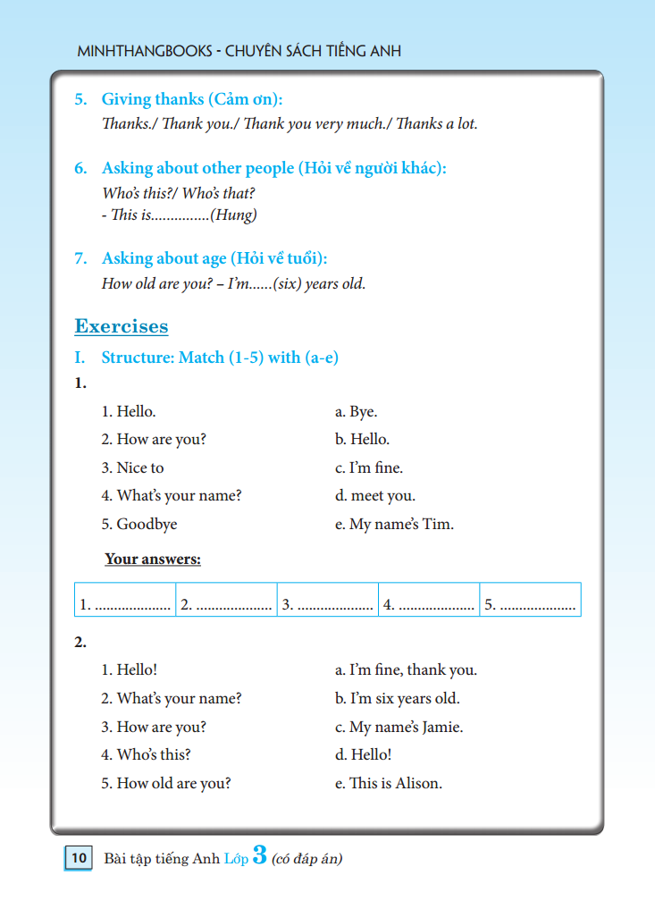 Sách dựa theo chương trình thí điểm tiếng Anh của Bộ Giáo Dục và Đào tạo ban hành. Dựa vào phương pháp dạy ngôn ngữ giao tiếp (Communicative Language Teaching Method), sách tập trung vào việc phát triển các kỹ năng ngôn ngữ cho học sinh tiểu học thông qua các dạng bài bổ ích, trong đó tập trung vào kỹ năng đọc hiểu, viết và sử dụng ngôn ngữ. Nội dung cuốn sách: bài tập tiếng anh lớp 3 - có đáp án được biên soạn theo các chủ điểm bám sát chương trình của Bộ Giáo dục và Đào tạo.