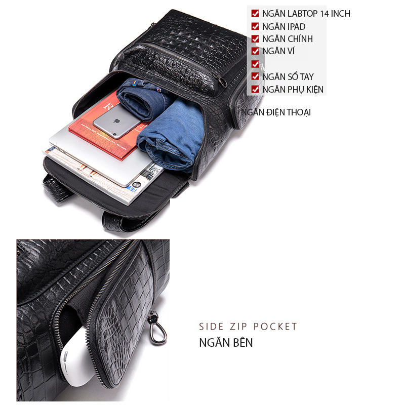 Kích thước : rộng 30cm X cao 39cm X dày 10.5cm Trọng lượng: 1.1 kg Dung tích: laptop 14 inch Màu sắc: Nâu, Đen Phương pháp sản xuất: thủ công Chất liệu : Da BÒ