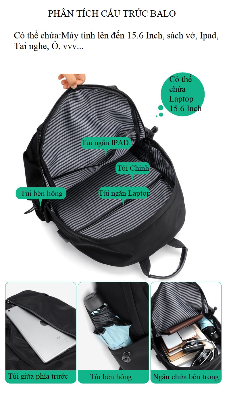 Balo có thiết kế nhiều ngăn rộng rãi để được máy tính lên đến 15.6 Inch, điện thoại, máy tính bảng, cặp sách vv.