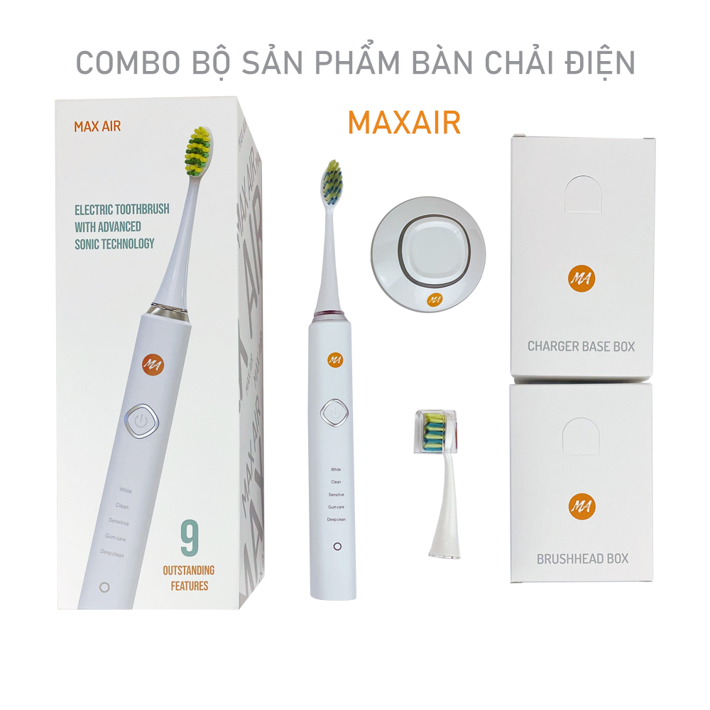 Bàn chải đánh răng điện MaxAir công nghệ sóng âm Sonic, 5 chế độ rung, tặng kèm 2 đầu bàn chải, hàng chính hãng Bộ sản phẩm bao gồm: 1 thân máy bàn chải đánh răng điện, 2 đầu bàn chải đánh răng thay thế, 1 sạc không dây thông minh, 1 sách HDSD THÔNG TIN SẢN PHẨM BÀN CHẢI ĐÁNH RĂNG ĐIỆN TỰ ĐỘNG MAX AIR: ️ Sản phẩm: Bàn chải đánh răng điện công nghệ sóng âm Sonic ️ Thương hiệu: Max Air ️ Model: MA004 ️ Điện áp định mức: DC3.7V ️ Công suất: 3W ️ Chất liệu chính: ABS, TPE ️ Dung lượng pin: 700mAh ️ Độ ồn nhỏ hơn: 65dB ️ Trọng lượng : 0,538 kg ️ Kích thước sản phẩm (bàn chải và đầu bàn chải): 25.6x25.7x253 mm ️ Kích thước bao bì: 250x83x90 mm   ƯU ĐIỂM CỦA BÀN CHẢI ĐÁNH RĂNG ĐIỆN TỰ ĐỘNG CHÍNH HÃNG MAXAIR Bàn chải điện MaxAir bản cao cấp sử dụng công nghệ sóng âm Sonic với tối đa 40.000 nhịp rung/phút 5 chế độ đánh răng tự động thông minh: White - Chế độ làm trắng Clean - Chế độ làm sạch Sensitive - Chế độ cho răng nhạy cảm Gum Care: Chế độ chăm sóc nướu (đặc biệt) Deep Clean: Chế độ làm sạch chuyên sâu Bàn chải đánh răng màu trắng đẹp và thanh lịch, bề mặt dễ lau chùi vệ sinh, phù hợp với mọi đối tượng sử dụng Thiết kế nhỏ gọn, dễ dàng sử dụng, chất liệu nhựa nhám cầm chắc tay, chống trơn trượt, chống mốc an toàn sử dụng trong phòng tắm Công nghệ động cơ Maglev máy chạy bền, êm, giảm tiếng ồn hiệu quả Công nghệ chống thấm nước IPX7 Khả năng ghi nhớ chế độ đánh răng sử dụng gần nhất Tính năng Quadpacer nhắc nhở chuyển vùng sau mỗi 30s Tính năng hẹn giờ thông minh, tạo thói quen chải răng khoa học trong 2 phút theo khuyến cáo của Nha Sĩ Sạc không dây nam châm thông minh sáng khi sạc và tự tắt khi đã sạc đầy Thời gian sử dụng pin trong 21 ngày khi sạc đầy HƯỚNG DẪN SỬ DỤNG BÀN CHẢI ĐIỆN MAX AIR