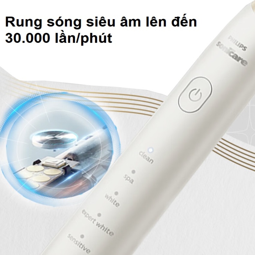 - Đầu chải được thiết kế viền lông độc đáo, kết hợp với tốc độ và cường độ vượt trội, bàn chải điện Sonicare giúp tối ưu hóa việc làm sạch và chăm sóc răng miệng Chế độ spa sáng tạo với công nghệ rung âm tiên tiến