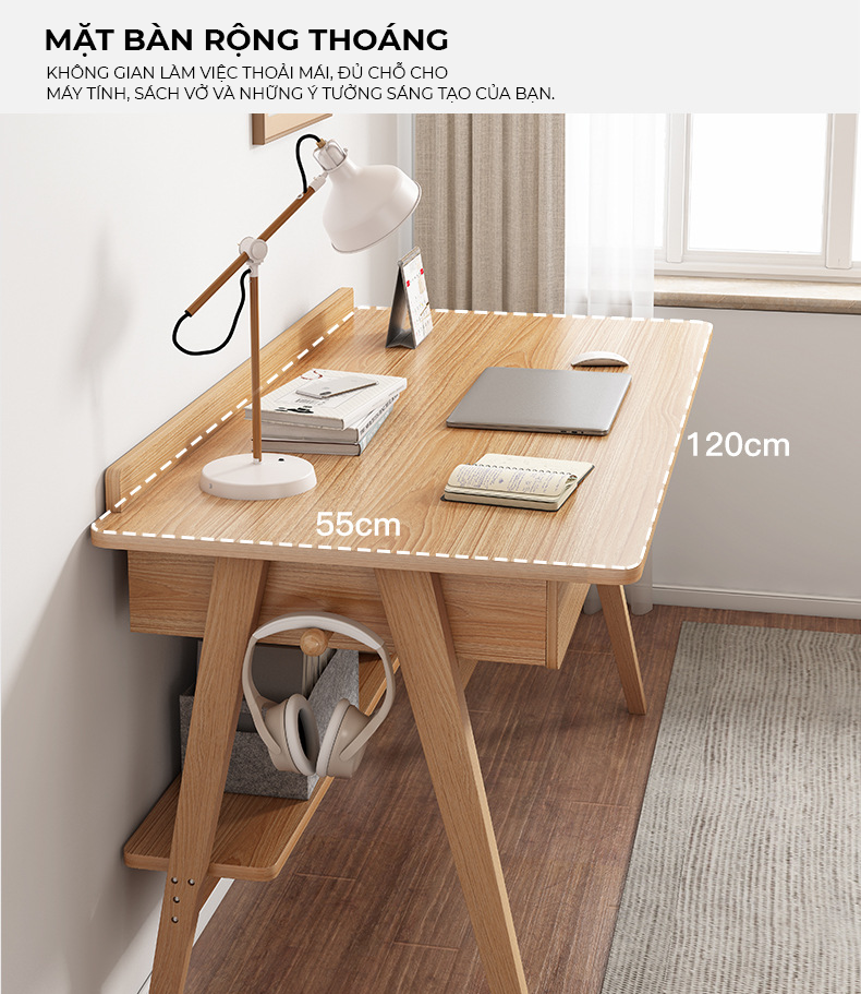 - Tên sản phẩm: Bàn làm việc kèm ngăn kéo và kệ để đồ - Chất liệu: Gỗ MDF phủ melamine cao cấp chống xước - chân bàn gỗ tự nhiên - Màu sắc: Vân gỗ sồi - Kích thước: 80/120 x 55 x 82cm (dài x rộng x cao) - Công năng: Là mẫu bàn làm việc, bàn học giúp tiết kiệm diện tích không gian phòng