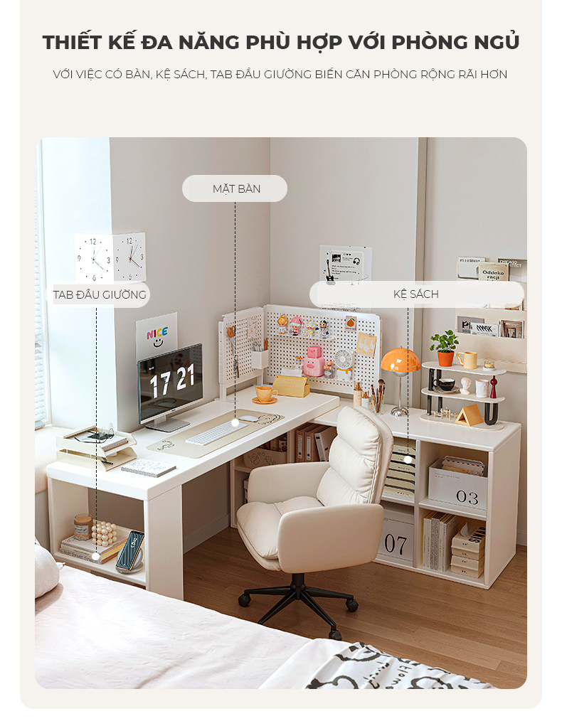 Công năng: Là chiếc bàn làm việc, bàn học vô cùng tiện dụng khi có giá sách đi kèm.