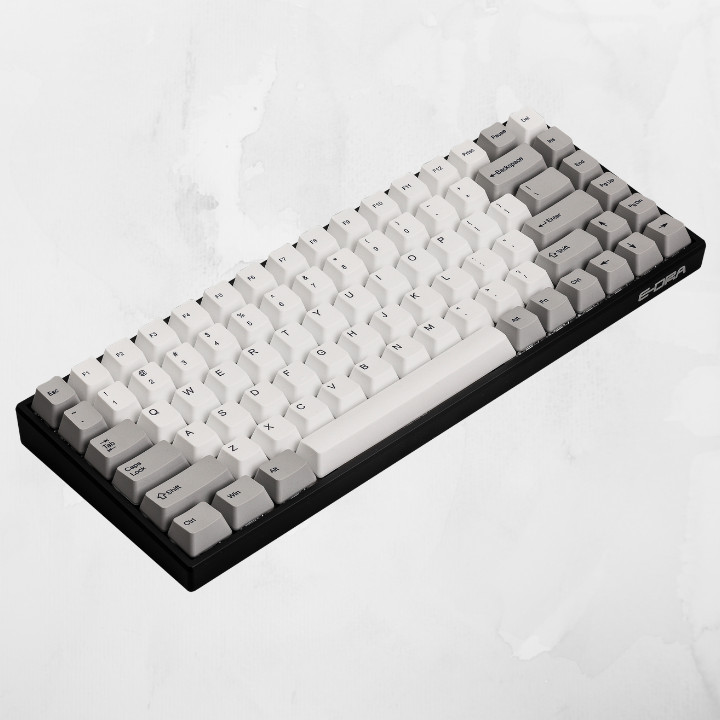 Bàn phím cơ E-Dra EK398 Alpha (White – Black) bố trí phối màu keycap màu đen ở giữa xen kẽ màu trắng ở bên, với layout 89 nút phím, có núm vặn bên phải phía trên