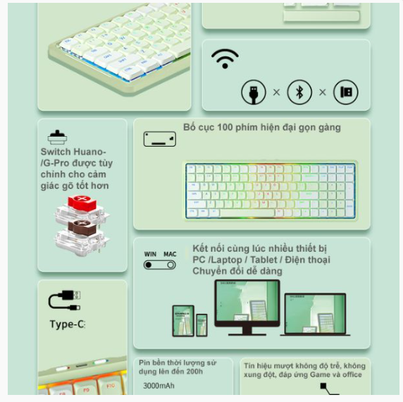 THÔNG SỐ KỸ THUẬT: Tên sản phẩm: Bàn phím cơ không dây Dualmode NEWMEN Mama SK01 Matcha Milk Sugar Phương thức kết nối : bluetooth , 2.4g , có dây C Số lượng phím 100 Switch : Được tinh chỉnh cảm giác huannuo low, G-Pro Low Chuyển đổi toàn bộ  : hỗ trợ Hotswap : hỗ trợ Led: rgb Chất liệu keycap pbt, keycap pbt mờ Giao diện dây : cáp bện 1.8m giao diện type-c Dung lượng pin : 3000mah Đầu vào định mức 5v1.5a Kích thước sản phẩm : 381.8 x 134.8 x 27.7mm Trọng lượng : 654g (Phím) Hỗ trợ hệ thống : win 7/8/10/11, android7.0 trở lên, mac osx10.10 trở lên (android tương thích với các chức năng phím cơ bản) Một số thông số đến từ newmen lab hoặc đo thủ công, nên có thể có sai sót, vui lòng tham khảo sản phẩm thực tế để biết thêm chi tiết Bảo hành: 24 tháng MÔ TẢ SẢN PHẨM: Công nghệ khung hợp kim nhôm : Mỏng, chắc chắn, cảm giác chân thật chất lượng cao Keycap pbt doubleshot : Thoải mái hơn khi chạm vào 2 chế độ và 3 phương thức kết nối : Có dây & không dây: Bluetooth | 2.4g Switch: G-Pro / huannuo : Tùy chọn : Mượt mà, ổn định, thoải mái Săp xếp 100 phím : Bố cục nhỏ gọn Tương thích nhiều hệ thống : Thích ứng mac, win, android, harmony os2.0… Giao diện type-c dây rời Pin dung lượng lớn 3000mah Toàn phím không xung , game và văn phòng đều tuyệt vời KHung mỏng bằng hợp kim nhôm Mỏng, chắc chắn, kết cấu tốt Khung áp dụng kỹ thuật anodizing nhôm ( quá trình điện hóa nhằm làm tăng độ dày lớp oxit hình thành tự nhiên trên bề mặt nhôm từ nanomet thành micronmet), Thiết kế cấu trúc nhẹ và mỏng, độ dày của bàn phím mỏng tới 8.6mm và thiết kế góc công thái học 6 độ giúp bàn phím trở nên tinh tế và độc đáo hơn 2chế độ hoạt động và 3 phương thức kết nối: Hỗ trợ ba phương thức kết nối bluetooth, 2.4g, có dây. Bluetooth hỗ trợ kết nối 3 thiết bị cùng lúc, fn +1/2/3 có thể nhanh chóng chuyển đổi thiết bị để sử dụng Kết nối cùng lúc 5 thiết bị hoạt động chuyển đổi dễ đàng giữa 5 thiết bị. 2 loại switch có sẵn Xanh, đỏ, nâu có sẵn nhiều loại trục, bạn có thể lựa chọn trục theo nhu cầu của bản thân Switch huannuo :  xanh,  đỏ,  nâu Swich xanh (Clicky ) : Phản hồi giống như bật dây cung, gẩy dây đàn : Tổng hành trình 3.1±0.2mm, hành trình dẫn truyền 1.2±0.3mm, độ lực chạm đáy 50±10gf, tuổi thọ 50 triệu Switch đỏ (Linear) : Tinh chỉnh cảm giác như nước chẩy mây trôi : Tổng hành trình 3.1±0.2mm, hành trình dẫn truyền 1.3±0.3mm, độ lực chạm đáy 45±8gf, tuổi thọ 50 triệu Switch nâu(Tactile) : Phản hồi giống như bật dây cung, gẩy dây đàn : tổng hành trình 3.1±0.2mm, hành trình dẫn truyền 1.4±0.4mm, độ lực chạm đáy 42±8gf, tuổi thọ 50 triệu Switch G-PRO 2.0 :  đỏ,  nâu Cảm giác mềm mượt trong tầm tay Switch đỏ(Clicky) : : tinh chỉnh cảm giác như nước chẩy mây trôi : tổng hành trình 3.1±0.2mm, hành trình dẫn truyền 1.3±0.3mm, độ lực chạm đáy 45±8gf, tuổi thọ 50 triệu Switch nâu (Tactile) : phản hồi giống như bật dây cung, gẩy dây đàn : tổng hành trình 3.2±0.2mm, hành trình dẫn truyền 1.7±0.4mm, độ lực chạm đáy 55±15gf, tuổi thọ 60 triệu Hiệu ứng ánh sáng mát mẻ  dễ chịu Đèn nền 16.8 triệu mầu + 16 hiệu ứng đèn nền Hiệu ứng đèn nền rgb thú vị, hiệu ứng đa dạng, thêm phần hứng thú khi chơi game Bật tắt hiệu ứng ánh sáng                             chuyển đổi hiệu ứng ánh sáng Chuyển đổi mầu sắc hiệu ứng                     chuyển đổi hiệu ứng ánh sáng trang trí Có thể cấu hình LED nhiều hình dạng: Trái tim, quả táo, trùm nho,… Keycap PBT Doubleshot Keycap sử dụng pbt mờ, phối mầu gradient, so với keycap truyền thống, chúng có khả năng chống mài mòn cao hơn và sử dụng lâu dài mà không cần bôi trơn, bề mặt tiếp xúc hình cầu, thoải mái hơn khi chạm vào Switch có cơ chế Hotswap Switch G-Pro và huannuo có thể tự do hoán đổi cho nhau Hỗ trợ các đế trục có thể được thay thế  và có thể được  dựng theo nhu cầu. các switch khác nhau có thể lắp với các vị trí phím khác nhau, bạn có thể đồng thời trải nghiệm cảm giác khác nhau trên cùng 1 bàn phím Kết nối ba thiết bị bluetooth : bạn có thể chuyển đổi giữa ba thiết bị theo ý muốn thông qua fn + 1/2/3 kéo công tắc sang chế độ bluetooth, nhấn và giữ fn  +1/2/3 trong 3 giây để kết nối mã với thiết bị mới Đèn báo 1 : khi sạc , đèn báo sạc sẽ nhấp nháy 2 : đèn báo chế độ Xanh đậm : kết nối bluetooth Cam : kết nối có dây Xanh lá : kết nối 2.4g