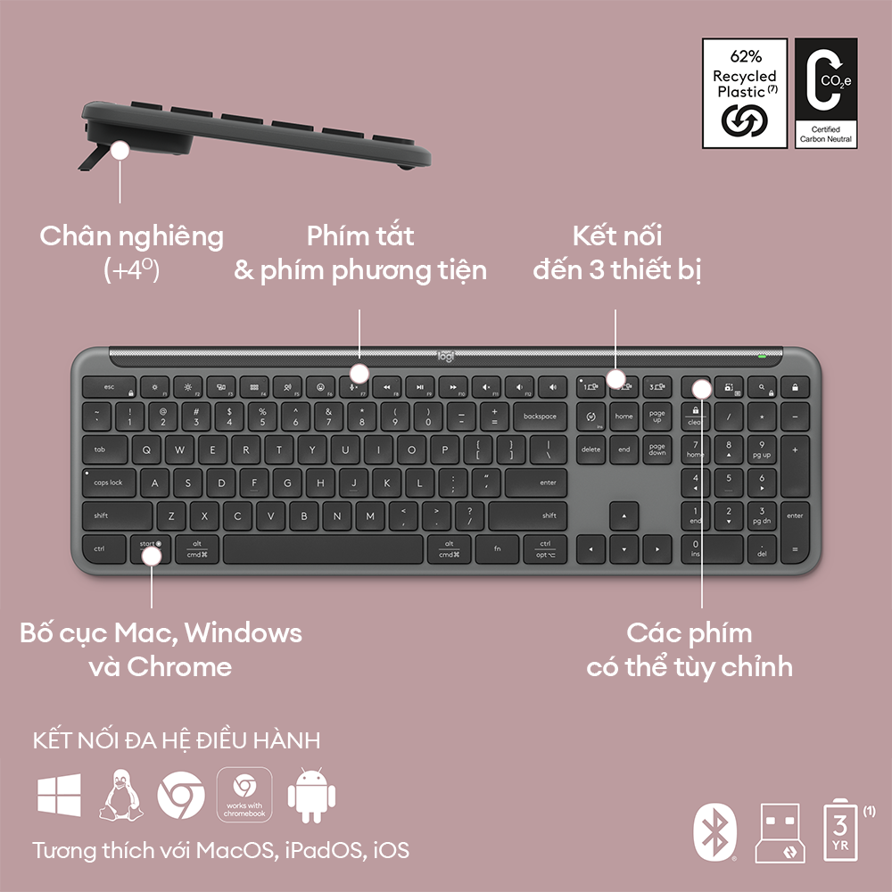 Hoạt động trên hầu hết các nền tảng: Kết nối không dây đơn giản với Windows, macOS, ChromeOS, Linux, iPadOS, iOS và Android, dễ dàng ghép cặp qua Bluetooth hoặc Logi Bolt