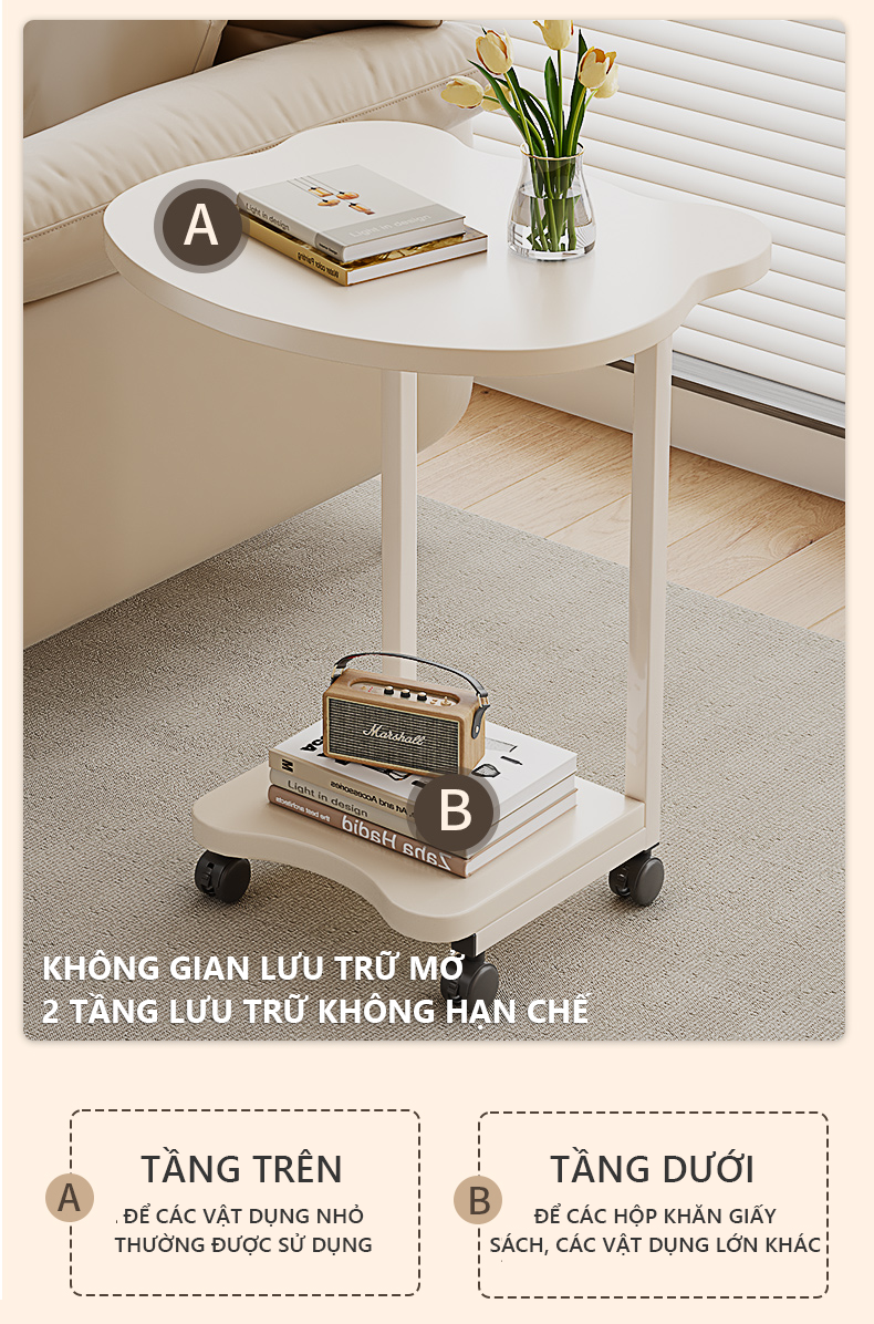 Công năng: Là mẫu bàn phụ sofa có thiết kế hiện đại đẹp mắt, cấu tạo đơn giản gọn nhẹ tinh tế giúp bạn có 1 chiếc bàn cafe, bàn decor phòng khách hiệu quả.