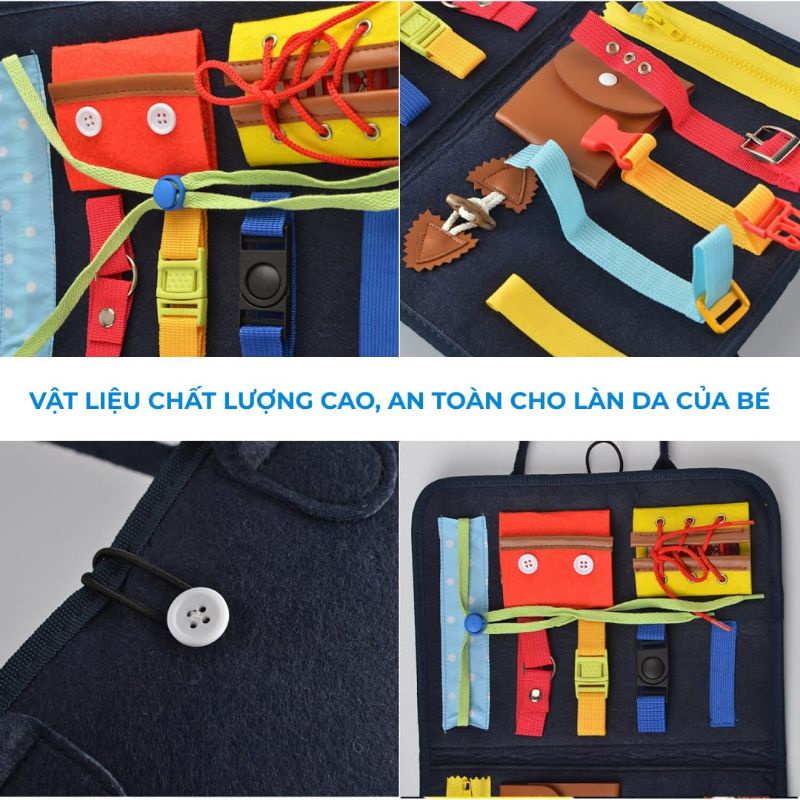 Bé của bạn có thể học cách hoạt động của dây kéo, bánh răng, hạt và khóa, cũng như cách buộc và tháo dây giày. Từ đó con có thể học tự mặc quần áo, tự kéo khóa, đóng cúèn luyện cách sống tự lập ngay khi còn nhỏ.