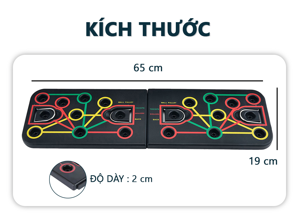 Mô tả chi tiết sản phẩm dụng cụ hướng dẫn tập luyện hít đất. - Kích thước sản phẩm:64 * 20 * 1.75. - Chất liệu: Nhựa ABS siêu bền. - Dụng cụ tập hít đất chuyên