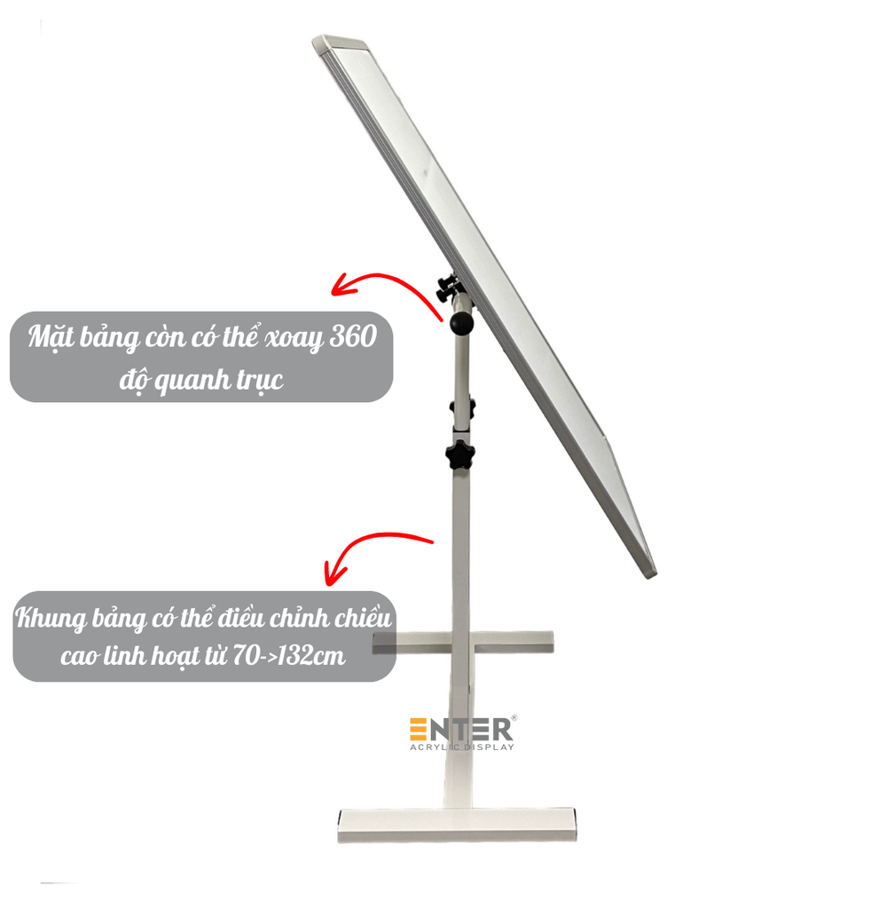 Bảng di động Enter KT303 với thiết kế đơn giản cùng các tone màu trắng phối chi tiết đen, có thế điều chỉnh chiều cao tối thiểu từ 70cm và tối đa đến 132cm hoàn toàn thích hợp với nhiều mục đích và không gian sử dụng như dùng để trình bày trong hội thảo, giảng day, họp nhóm tại công ty, trường học,...
