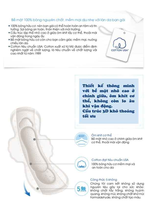 Băng vệ sinh ban ngày cotton: Thành phần và công dụng: BVS có khả năng thấm hút tốt phân giải nhanh chống , đồng thời khử mùi, mang lai cho bạn cảm giác thoáng mát