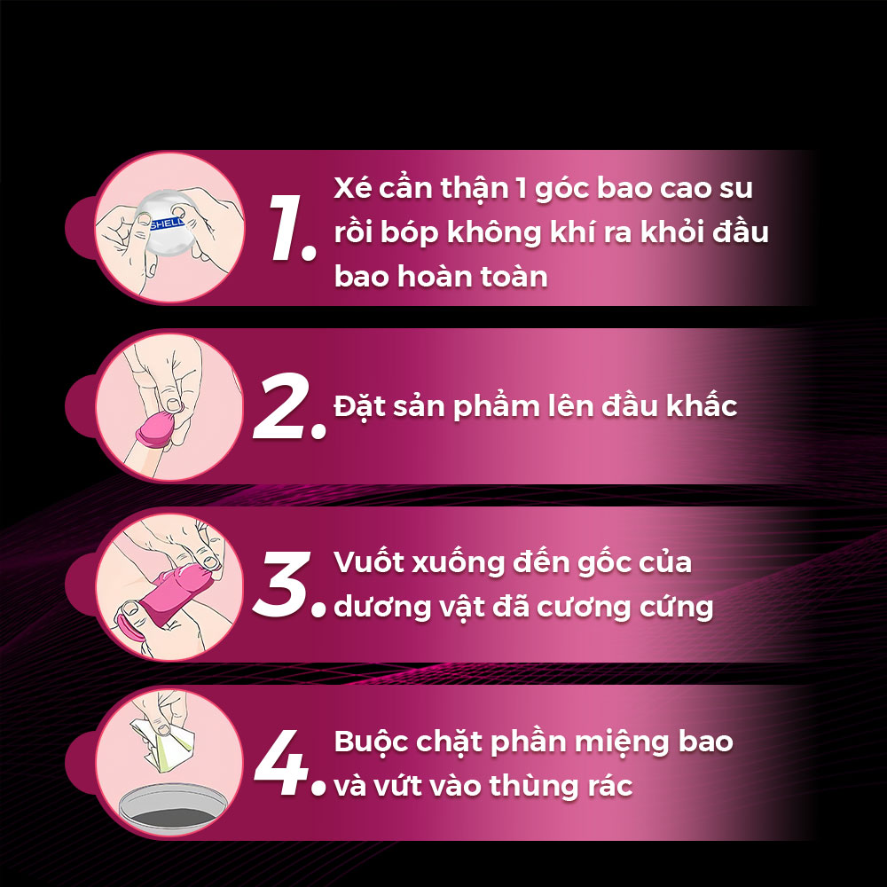 ✪ Cách dùng: Nhẹ nhàng xé 1 góc trên bao bì rồi lấy sản phẩm ra ngoài. Tiếp theo, người dùng lấy tay bóp phần đầu bao để đẩy hết khí thừa. Sau đó, đặt “áo mưa” lên đầu khấc, vuốt từ từ cho đến sát gốc cậu nhỏ. Đeo thêm vòng đeo để kéo dài thời gian quan hệ. Quan hệ xong rút bao nhẹ nhàng và thắt lại để tinh dịch không tràn ra ngoài. Thắt miệng bao cao su rồi đặt vào thùng rác. Vòng đeo vệ sinh lại và bảo quản để lần sau sử dụng.