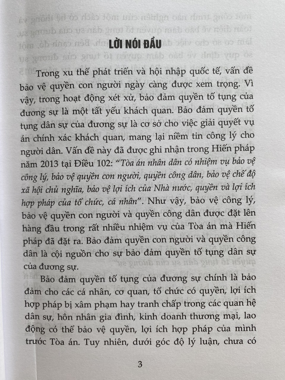 Trong xu thế phát triển và hội nhập quốc tế , vấn đề bảo vệ quyền con người ngày càng được xem trọng . Vì vậy , trong hoạt động xét xử , bảo đảm quyền tố tụng của đương sự là một tất yếu khách quan . Bảo đảm quyền tố tụng dân sự của đương sự là cơ sở cho việc giải quyết vụ án chính xác khách quan , mang lại niềm tin công lý cho người dân . Vấn đề này đã được ghi nhận trong Hiến pháp năm 2013 tại Điều 102 : “ Tòa án nhân dân có nhiệm vụ bảo vệ công lý , bảo vệ quyền con người , quyền công dân , bảo vệ chế độ xã hội chủ nghĩa , bảo vệ lợi ích của Nhà nước , quyền và lợi ích hợp pháp của tổ chức , cá nhân ”